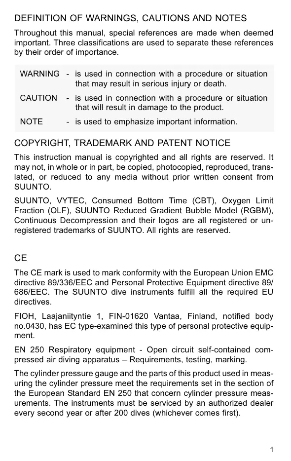 The CE mark is used to mark conformity with the European Union EMC directive 89/336/EEC and Personal Protective Equipment directive 89/ 686/EEC. The SUUNTO dive instruments fulfill all the required EU directives. FIOH, Laajanityntie 1, FIN-01620 Vantaa, Finland, notified body no.0430, has EC type-examined this type of personal protective equip- ment. EN 250 Respiratory equipment - Open circuit self-contained com- pressed air diving apparatus — Requirements, testing, marking. The cylinder pressure gauge and the parts of this product used in meas- uring the cylinder pressure meet the requirements set in the section of the European Standard EN 250 that concern cylinder pressure meas- urements. The instruments must be serviced by an authorized dealer every second year or after 200 dives (whichever comes first).