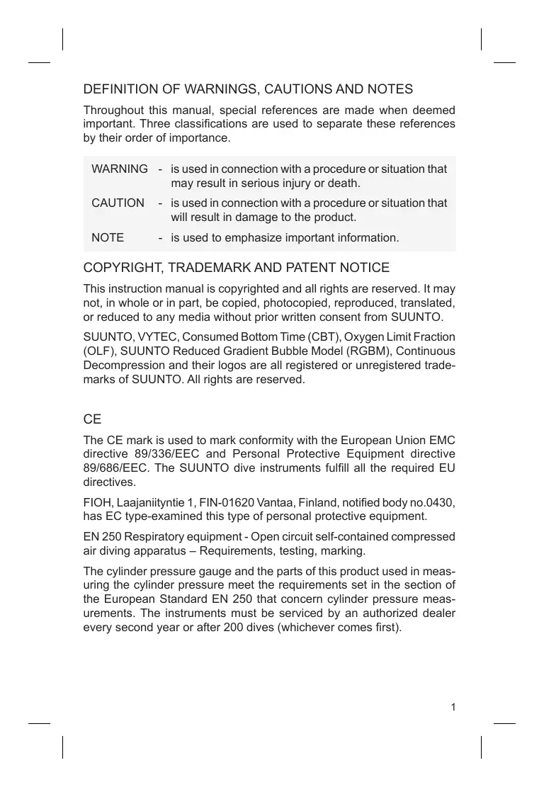 The CE mark is used to mark conformity with the European Union EMC directive 89/336/EEC and Personal Protective Equipment directive 89/686/EEC. The SUUNTO dive instruments fulfill all the required EU directives. FIOH, Laajaniityntie 1, FIN-01620 Vantaa, Finland, notified body n0.0430, has EC type-examined this type of personal protective equipment. EN 250 Respiratory equipment - Open circuit self-contained compressed air diving apparatus — Requirements, testing, marking. The cylinder pressure gauge and the parts of this product used in meas- uring the cylinder pressure meet the requirements set in the section of the European Standard EN 250 that concem cylinder pressure meas- urements. The instruments must be serviced by an authorized dealer every second year or after 200 dives (whichever comes first).