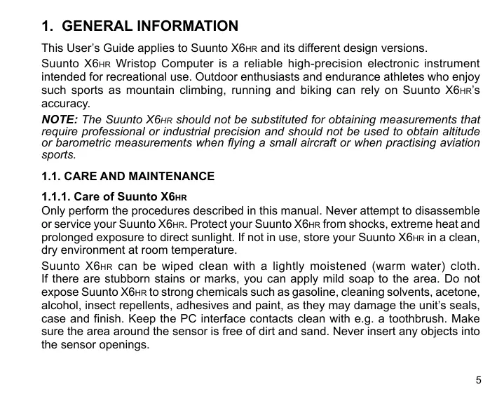 This User's Guide applies to Suunto X6Hr and its different design versions. Suunto X6HR Wristop Computer is a reliable high-precision electronic instrument intended for recreational use. Outdoor enthusiasts and endurance athletes who enjoy such sports as mountain climbing, running and biking can rely on Suunto X6HR'S accuracy. NOTE: The Suunto X6#r should not be substituted for obtaining measurements that require professional or industrial precision and should not be used to obtain altitude or barometric measurements when flying a small aircraft or when practising aviation sports.