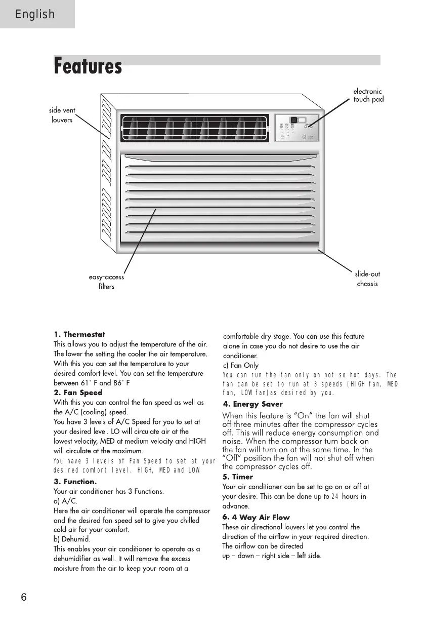 English + Air Condifioners are designed for use in a double hung window or through the wall installation only. (As applicable in your model) + While installing unit be sure to tilt air conditioner 5 degree outward to have the water drip outside the house + Install the unit on the north side as normally that is the shaded side. This will enhance the operation of your unit. + Window has to be strong for installation. Extra brackets and or support may be required depending on your window + Measure the window before installing, if the window is too big for the unit you may require professional installation. + Use correct electric voltage and proper ampere for the unit to run effectively. + Only let a certified electrician do any modifications to your electrical outlet. Energy Saving Guide + When installing your air conditioner make sure to seal all areas where there is a possibility of air leakage. + Airflow should not be blocked inside either by curtains, drapes or furniture or outside by shrubs or bushes. + Do not needlessly use an electrical light or other appliances that produce heat. + Keep the blinds and the drapes drawn on all the other windows. + While cooking use an exhaust fan in the kitchen to remove the excess heat produced + Always use the correct BTU size air conditioner to cool the room to attain optimum efficiency.
