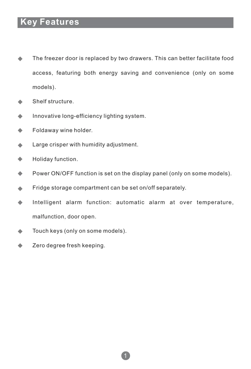 The freezer door is replaced by two drawers. This can better facilitate food access, featuring both energy saving and convenience (only on some models). Shelf structure. Innovative long-efficiency lighting system. Foldaway wine holder. Large crisper with humidity adjustment. Holiday function. Power ON/OFF function is set on the display panel (only on some models). Fridge storage compartment can be set on/off separately. Intelligent alarm function: automatic alarm at over temperature, malfunction, door open. Touch keys (only on some models). Zero degree fresh keeping.