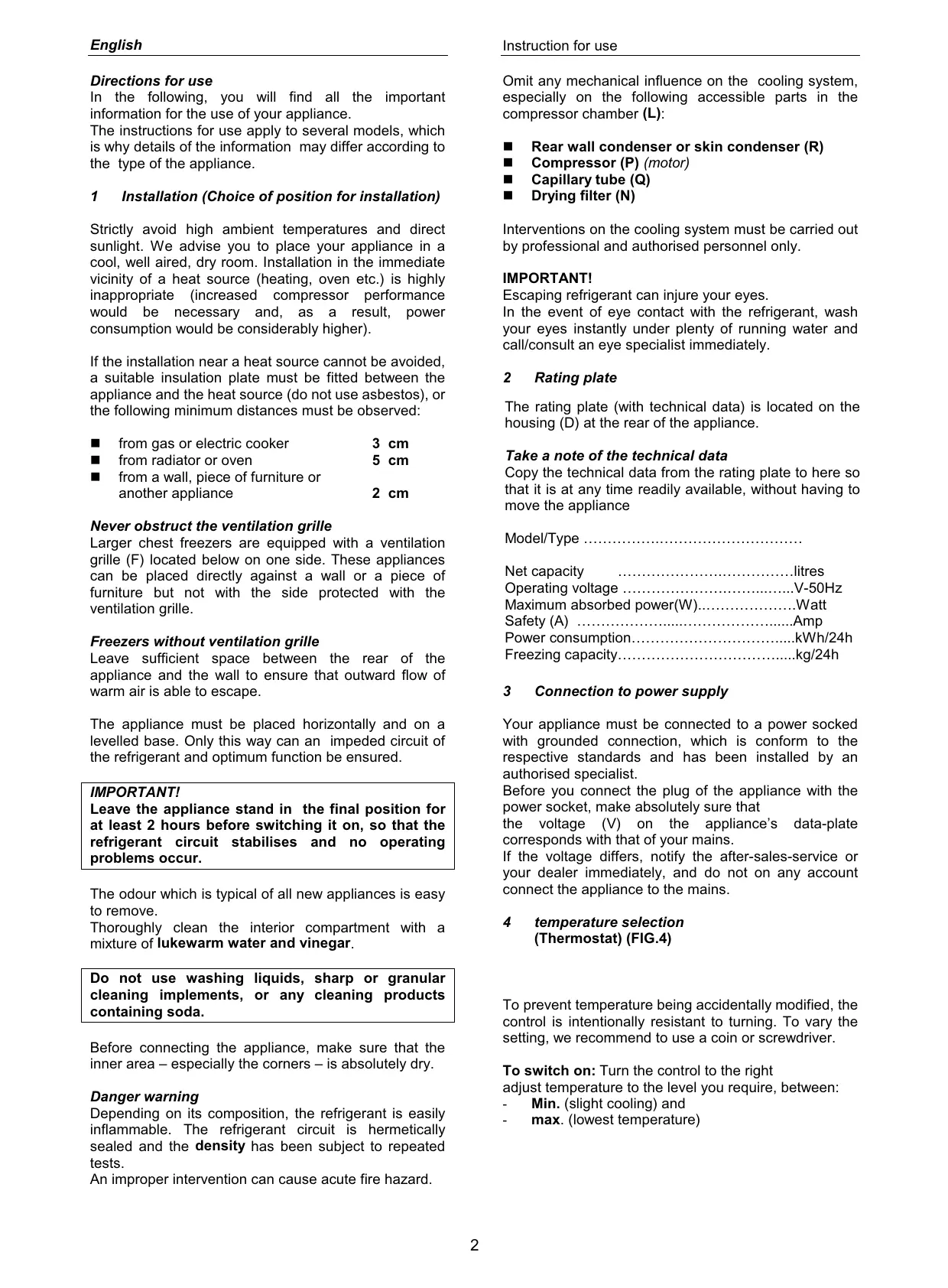 Rear wall condenser or skin condenser (R) Compressor (P) (motor) Capillary tube (Q) Drying filter (N) Installation (Choice of position for installation) Strictly avoid high ambient temperatures and direct sunlight. We advise you to place your appliance in a cool, well aired, dry room. Installation in the immediate vicinity of a heat source (heating, oven etc.) is highly inappropriate (increased compressor performance would be necessary and, as a result, power consumption would be considerably higher). Interventions on the cooling system must be carried out by professional and authorised personnel only. IMPORTANT! Escaping refrigerant can injure your eyes. In the event of eye contact with the refrigerant, wash your eyes instantly under plenty of running water and call/consult an eye specialist immediately. If the installation near a heat source cannot be avoided, a suitable insulation plate must be fitted between the appliance and the heat source (do not use asbestos), or the following minimum distances must be observed: from gas or electric cooker from radiator or oven from a wall, piece of furniture or another appliance