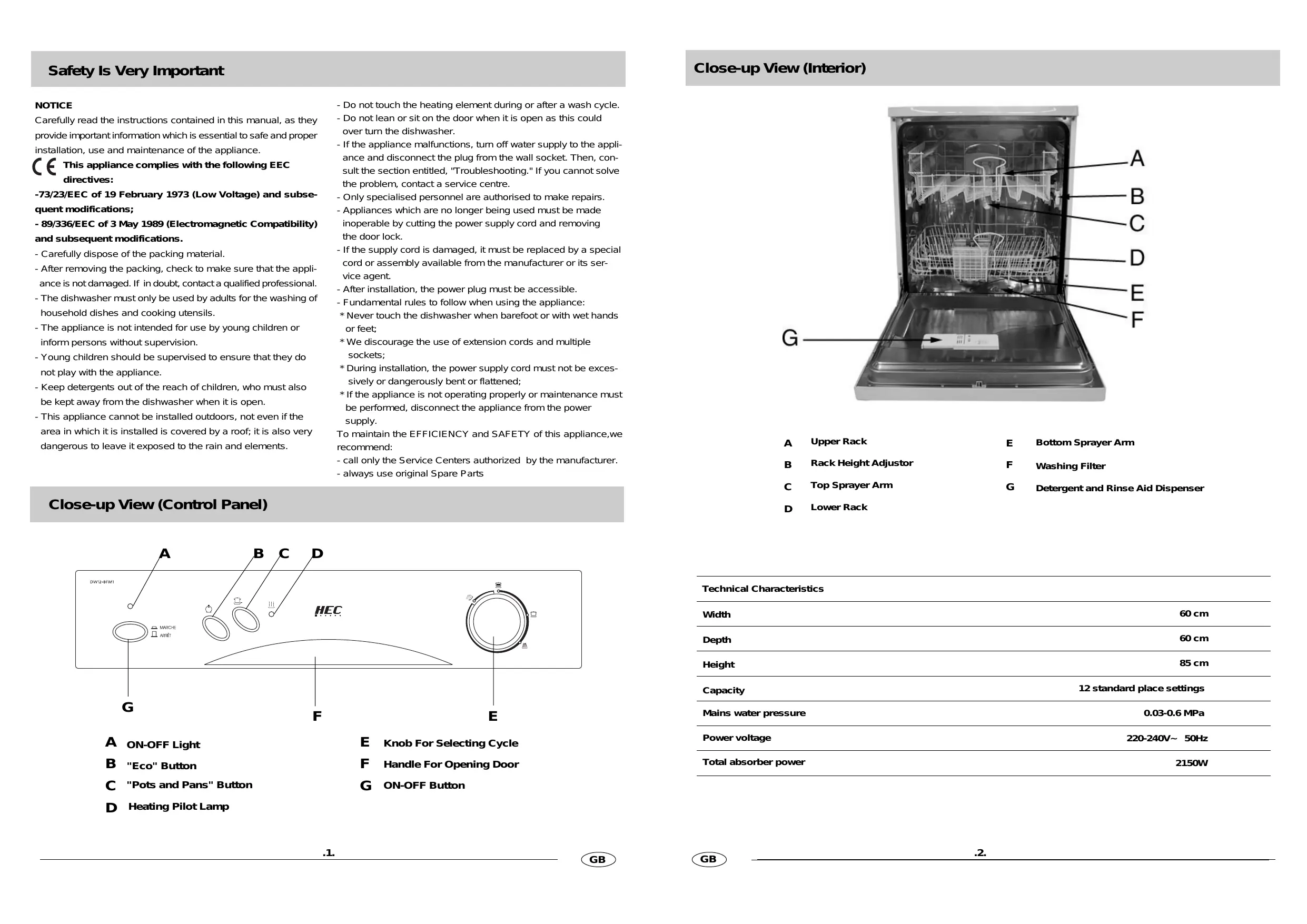 Safety Is Very Important NOTICE Carefully read the instructions contained in this manual, as they provide important information which is essential to safe and proper installation, use and maintenance of the appliance. This appliance complies with the following EEC directives: -73/23/EEC of 19 February 1973 (Low Voltage) and subse- quent modifications; - 89/336/EEC of 3 May 1989 (Electromagnetic Compatibility) and subsequent modifications. - Carefully dispose of the packing material. - After removing the packing, check to make sure that the appli- ance is not damaged. If in doubt, contact a qualified professional. - The dishwasher must only be used by adults for the washing of household dishes and cooking utensils. - The appliance is not intended for use by young children or inform persons without supervision. - Young children should be supervised to ensure that they do not play with the appliance. - Keep detergents out of the reach of children, who must also be kept away from the dishwasher when it is open. - This appliance cannot be installed outdoors, not even if the area in which itis installed is covered by a roof it is also very dangerous to leave it exposed to the rain and elements. Close-up View (Control Panel) AU PFP - Do not touch the heating element during or after a wash cycle. - Do not lean or sit on the door when it is open as this could over turn the dishwasher. - Ifthe appliance malfunctions, tum off water supply to the appli- ance and disconnect the plug from the wall socket. Then, con- sult the section entitled, ‘Troubleshooting." If you cannot soive the problem, contact a service centre. - Only specialised personnel are authorised to make repairs. - Appliances which are no longer being used must be made inoperable by cutting the power supply cord and removing the door lock. - Ifthe supply cord is damaged, it must be replaced by a special cord or assembly available from the manufacturer or its ser- vice agent. - After installation, the power plug must be accessible. - Fundamental rules to follow when using the appliance: + Never touch the dishwasher when barefoot or with wet hands or feet; We discourage the use of extension cords and multiple sockets;