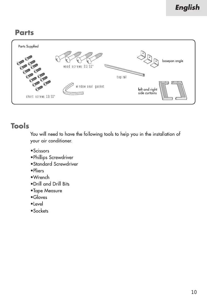 short screus 13/32 window seal gasket . lef and right ——) side curtains Tools You will need to have the following tools to help you in the installation of your air conditioner. eScissors *Phillips Screwdriver +Standard Screwdriver ePliers *Wrench +Drill and Drill Bits «Tape Measure eGloves «Level *Sockets
