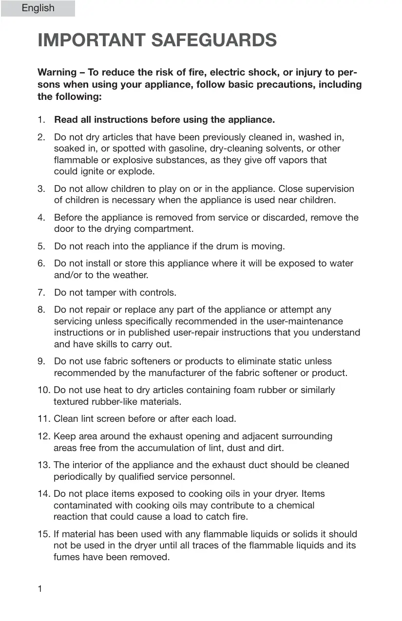 14. Do not place items exposed to cooking oils in your dryer. Items