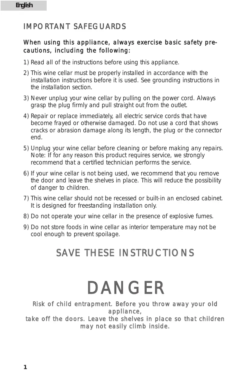 wine cellar before cleaning. Ignoring this warning may result in death or injury. Caution: Before using cleaning products, always read and follow manufacturer’s instructions and warnings to avoid personal injury or product damage. General: