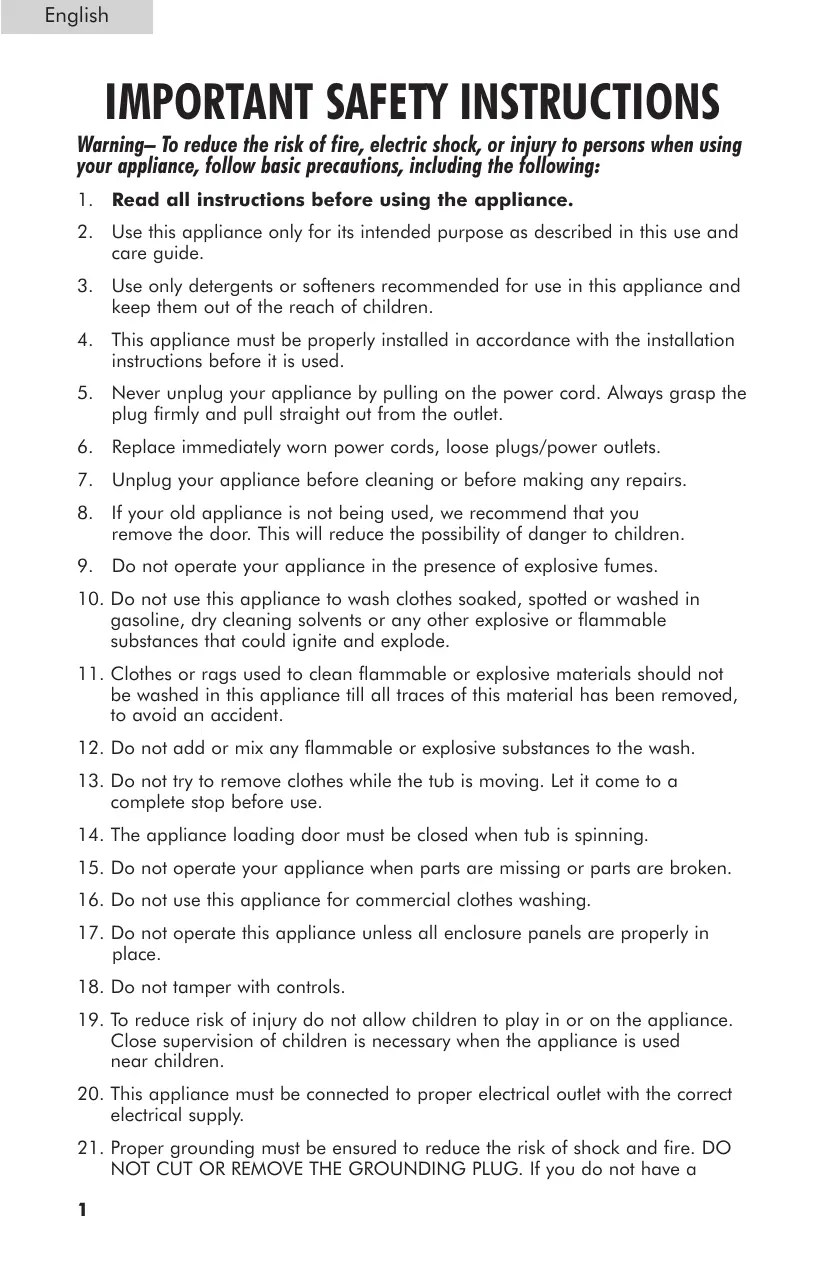 10. Do not use this appliance to wash clothes soaked, spotted or washed in