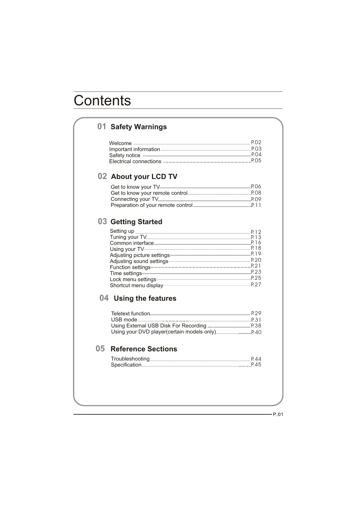 Please read this manual carefully before operating the unit, and keep it for future reference. Contents 01 Safety Warnings Welcome Important information Safety notice Electrical connections P.02 P.03 P.04 P.05 02 About your LCD TV Get to know your TV Get to know your remote control Connecting your TV Preparation of your remote control P.06 P.08 P.09 P.11 03 Getting Started Setting up Tuning your TV Common interface Using your TV Adjusting picture settings Adjusting sound settings Function settings Time settings Lock menu settings Shortcut menu display P.12 P.13 P.16 P.18 P.19 P.20 P.21 P.23 P.25 P.27 04 Using the features Teletext function USB mode Using External USB Disk For Recording Using your DVD player(certain models only) P.29 P.31 P.38 P.40 05 Reference Sections Troubleshooting Specification P.44 P.45