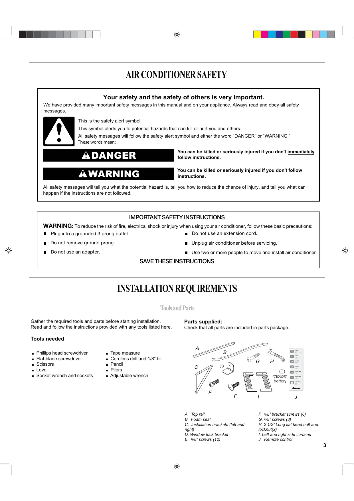 WARNING: To reduce the risk of fire, electrical shock or injury when using your air conditioner, follow these basic precautions: "Plug into a grounded 3 prong outlet. m Do not use an extension cord. m Do not remove ground prong. = Unplug air conditioner before servicing. m Do not use an adapter. = Use two or more people to move and install air conditioner.