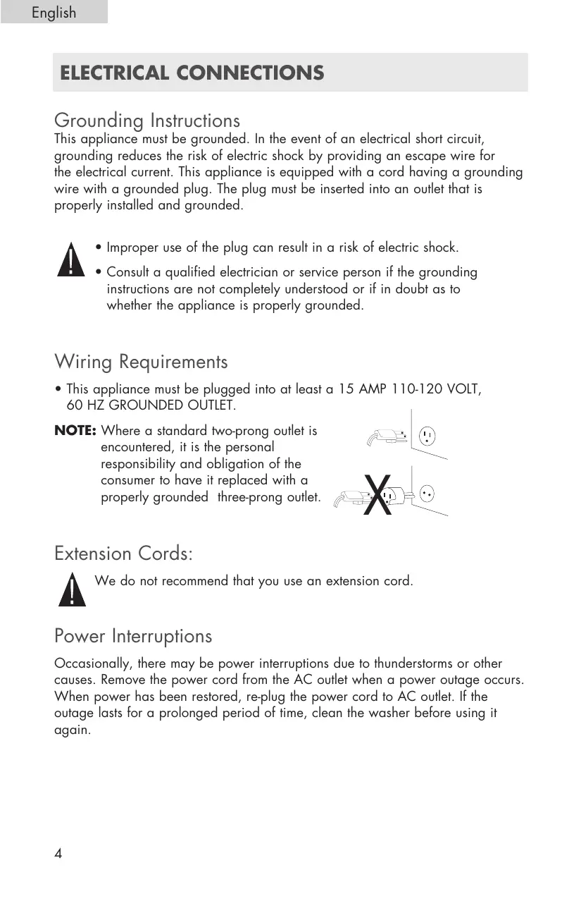 English ELECTRICAL CONNECTIONS Grounding Instructions This appliance must be grounded. In the event of an electrical short circuit, grounding reduces the risk of electric shock by providing an escape wire for the electrical current. This appliance is equipped with a cord having a grounding wire with a grounded plug. The plug must be inserted into an outlet that is properly installed and grounded.