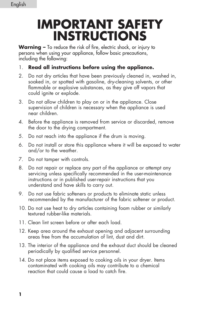 o not place items exposed to cooking oils in your dryer. Items contaminated with cooking oils may contribute to a chemical reaction that could cause a load to catch fire.