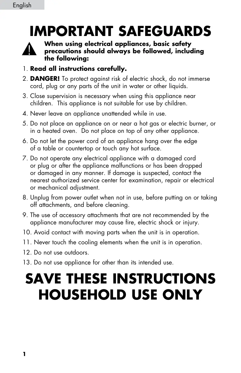 English SAFETY INSTRUCTIONS Electrical Requirements Wiring and Grounding Instructions This appliance must be plugged into at least a 15 AMP 110-115 VOLT 60 Hz GROUNDED OUTLET. This appliance must be grounded. It is equipped with a 3wire cord having a grounding plug. The plug must be plugged into an outlet that is properly installed and grounded. WARNING! Improper use of grounded wire can result in the risk of electric shock. Consult a physician if necessary. Do not attempt to defeat this safety feature by modifying the plug. Avoid the use of an extension cord because it may overheat and cause a risk of fire. However, if it is necessary to use an extension cord: A. Use only 3-wire extension cords with 3-blade grounding plug. B. T he marked rating of an extension cord must be be equal to or greater than the rating of this appliance. C. It should be positioned such that it does not drape over the counter or tabletop where it can be pulled on by children intentionally. Attempting any maintenance or cleaning: To minimize the possibility of electric shock, unplug this appliance from the power suply or disconnect at the household distribution panel by removing the fuse or switching off the circuit breaker before attempting any maintenance or cleaning. NOTE: