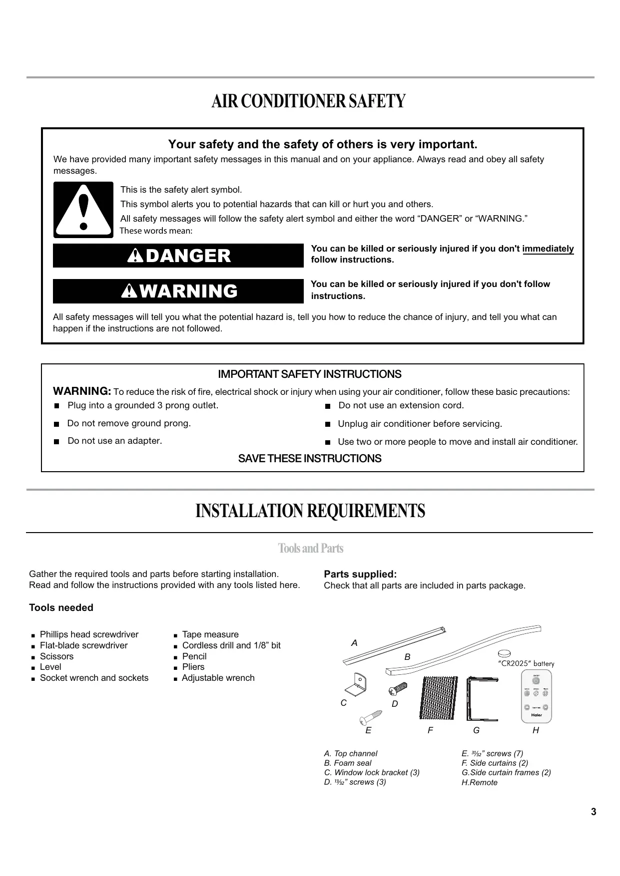WARNING: To reduce the risk of fire, electrical shock or injury when using your air conditioner, follow these basic precautions: Plug into a grounded 3 prong outlet. Do not use an extension cord. Do not remove ground prong. Unplug air conditioner before servicing. Do not use an adapter. Use two or more people to move and install air conditioner.