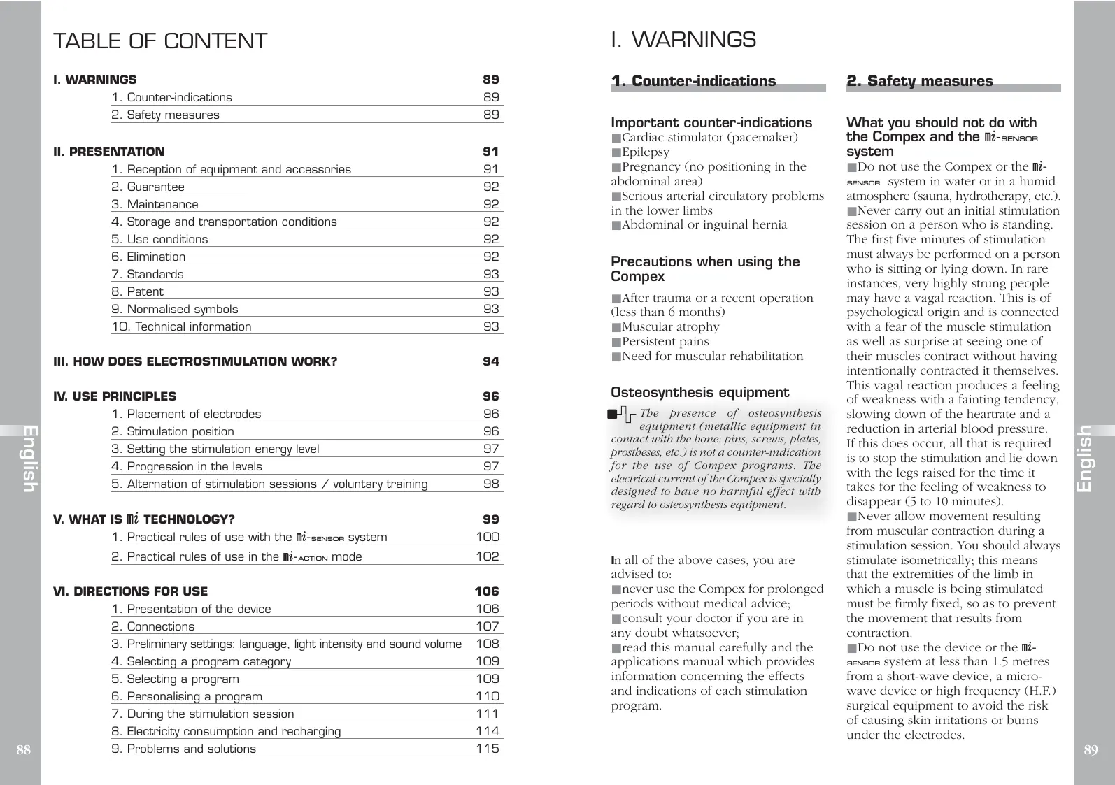 Important counter-indications What you should not do with the Compex and the m-4 system ■ Cardiac stimulator (pacemaker) ■ Epilepsy ■ Pregnancy (no positioning in the abdominal area) ■ Serious arterial circulatory problems in the lower limbs ■ Abdominal or inguinal hernia Precautions when using the Compex ■ After trauma or a recent operation (less than 6 months) ■ Muscular atrophy ■ Persistent pains ■ Need for muscular rehabilitation Osteosynthesis equipment The presence of osteosynthesis equipment (metallic equipment in contact with the bone: pins, screws, plates, prostheses, etc.) is not a counter-indication for the use of Compex programs. The electrical current of the Compex is specially designed to have no harmful effect with regard to osteosynthesis equipment. In all of the above cases, you are advised to: ■ never use the Compex for prolonged periods without medical advice; ■ consult your doctor if you are in any doubt whatsoever; ■ read this manual carefully and the applications manual which provides information concerning the effects and indications of each stimulation program. ■ Do not use the Compex or the m4 system in water or in a humid atmosphere (sauna, hydrotherapy, etc.). ■ Never carry out an initial stimulation session on a person who is standing. The first five minutes of stimulation must always be performed on a person who is sitting or lying down. In rare instances, very highly strung people may have a vagal reaction. This is of psychological origin and is connected with a fear of the muscle stimulation as well as surprise at seeing one of their muscles contract without having intentionally contracted it themselves. This vagal reaction produces a feeling of weakness with a fainting tendency, slowing down of the heartrate and a reduction in arterial blood pressure. If this does occur, all that is required is to stop the stimulation and lie down with the legs raised for the time it takes for the feeling of weakness to disappear (5 to 10 minutes). ■ Never allow movement resulting from muscular contraction during a stimulation session. You should always stimulate isometrically; this means that the extremities of the limb in which a muscle is being stimulated must be firmly fixed, so as to prevent the movement that results from contraction. ■ Do not use the device or the m4 system at less than 1.5 metres from a short-wave device, a microwave device or high frequency (H.F.) surgical equipment to avoid the risk of causing skin irritations or burns under the electrodes. English