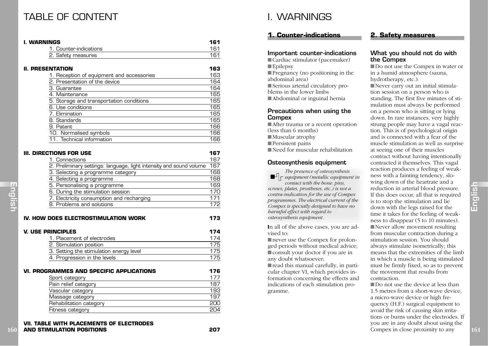 Important counter-indications What you should not do with the Compex ■ Cardiac stimulator (pacemaker) ■ Epilepsy ■ Pregnancy (no positioning in the abdominal area) ■ Serious arterial circulatory pro- blems in the lower limbs ■ Abdominal or inguinal hernia Precautions when using the Compex ■ After trauma or a recent operation (less than 6 months) ■ Muscular atrophy ■ Persistent pains ■ Need for muscular rehabilitation Osteosynthesis equipment The presence of osteosynthesis equipment (metallic equipment in contact with the bone: pins, screws, plates, prostheses, etc.) is not a contra-indication for the use of Compex programmes. The electrical current of the Compex is specially designed to have no harmful effect with regard to osteosynthesis equipment. I n all of the above cases, you are advised to: ■ never use the Compex for prolonged periods without medical advice; ■ consult your doctor if you are in any doubt whatsoever; ■ read this manual carefully, in particular chapter VI, which provides information concerning the effects and indications of each stimulation programme. ■ Do not use the Compex in water or in a humid atmosphere (sauna, hydrotherapy, etc.). ■ Never carry out an initial stimulation session on a person who is standing. The first five minutes of stimulation must always be performed on a person who is sitting or lying down. In rare instances, very highly strung people may have a vagal reaction. This is of psychological origin and is connected with a fear of the muscle stimulation as well as surprise at seeing one of their muscles contract without having intentionally contracted it themselves. This vagal reaction produces a feeling of weakness with a fainting tendency, slowing down of the heartrate and a reduction in arterial blood pressure. If this does occur, all that is required is to stop the stimulation and lie down with the legs raised for the time it takes for the feeling of weakness to disappear (5 to 10 minutes). ■ Never allow movement resulting from muscular contraction during a stimulation session. You should always stimulate isometrically; this means that the extremities of the limb in which a muscle is being stimulated must be firmly fixed, so as to prevent the movement that results from contraction. ■ Do not use the device at less than