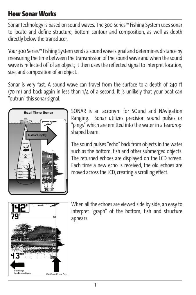 How Sonar Works Sonar technology is based on sound waves. The 300 Series" Fishing System uses sonar to locate and define structure, bottom contour and composition, as well as depth directly below the transducer. Your 300 Series" Fishing System sends a sound wave signal and determines distance by measuring the time between the transmission of the sound wave and when the sound wave is reflected off of an object; it then uses the reflected signal to interpret location, size, and composition of an object. Sonar is very fast. À sound wave can travel from the surface to a depth of 240 ft {70 m) and back again in less “outrun" this sonar signal. Real Time Sonar than 1/4 of a second. It is unlikely that your boat can SONAR is an acronym for SOund and NAvigation Ranging. Sonar utilizes precision sound pulses or pings" which are emitted into the water in a teardrop- shaped beam. The sound pulses "echo" back from objects in the water such as the bottom, fish and other submerged objects. The returned echoes are displayed on the LCD screen. Each time à new echo is received, the old echoes are moved across the LCD, creating a scrolling effect. When all the echoes are viewed side by side, an easy to interpret "graph" of the bottom, fish and structure appears.