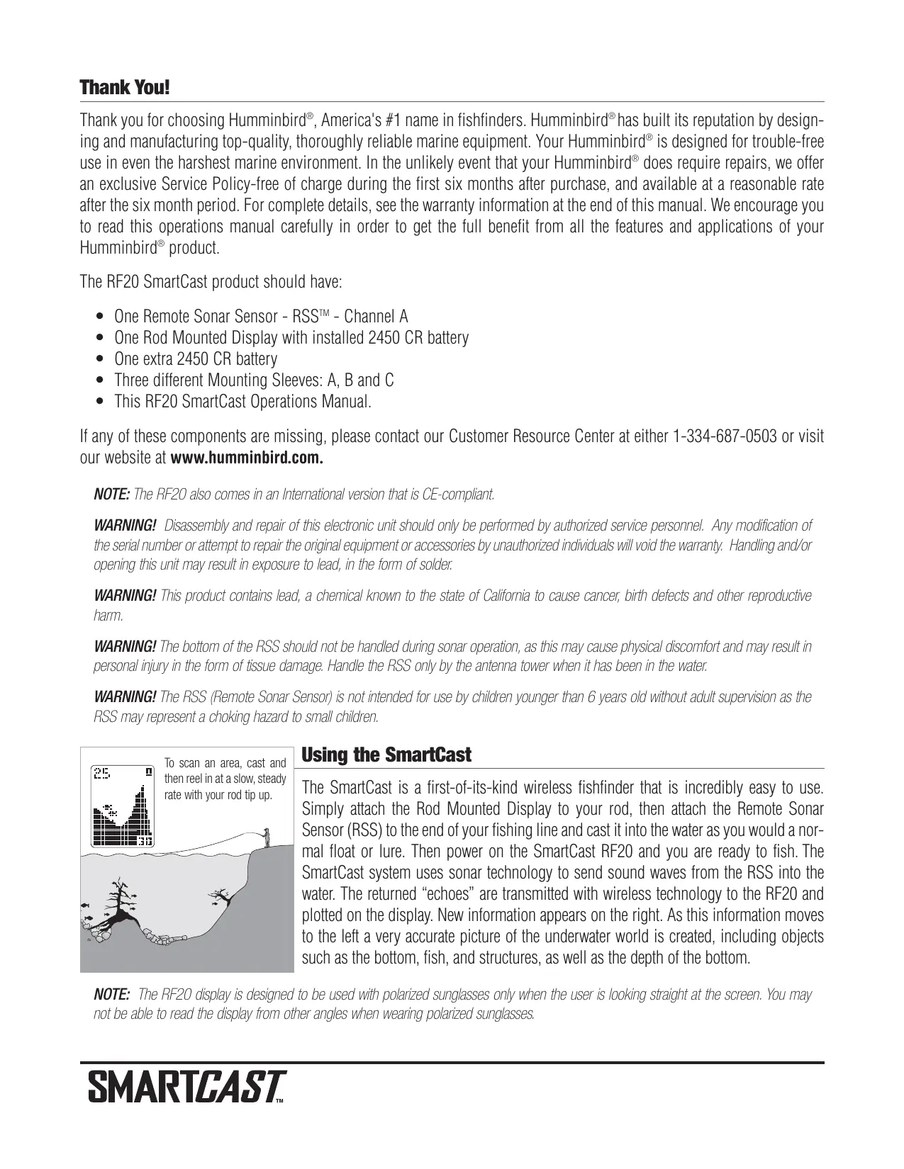 Thank You! Thank you for choosing Humminbird®, America's #1 name in fishfinders. Humminbird® has built its reputation by designing and manufacturing top-quality, thoroughly reliable marine equipment. Your Humminbird® is designed for trouble-free use in even the harshest marine environment. In the unlikely event that your Humminbird® does require repairs, we offer an exclusive Service Policy-free of charge during the first six months after purchase, and available at a reasonable rate after the six month period. For complete details, see the warranty information at the end of this manual. We encourage you to read this operations manual carefully in order to get the full benefit from all the features and applications of your Humminbird® product. The RF20 SmartCast product should have: