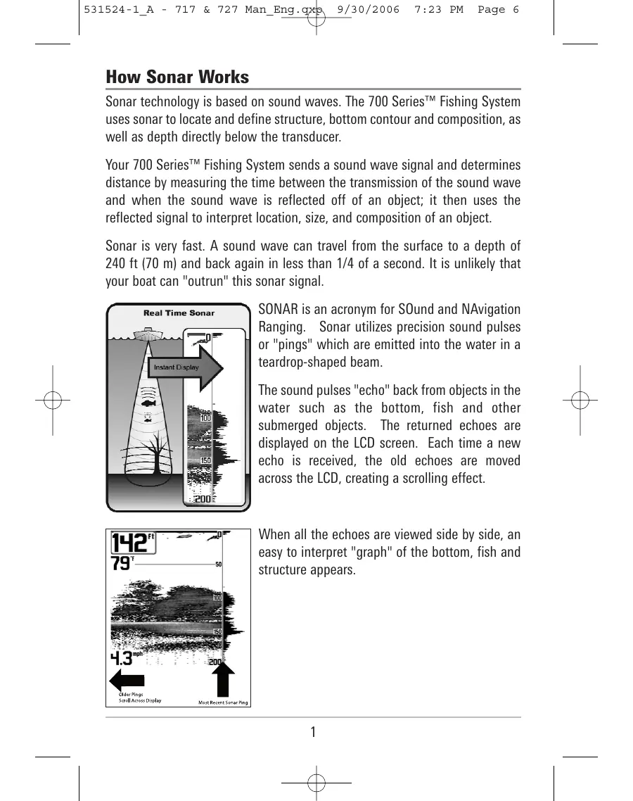 How Sonar Works Sonar technology is based on sound waves. The 700 Series'" Fishing System uses sonar to locate and define structure, bottom contour and composition, as well as depth directly below the transducer. Your 700 Series"" Fishing System sends a sound wave signal and determines distance by measuring the time between the transmission of the sound wave and when the sound wave is reflected off of an object; it then uses the reflected signal to interpret location, size, and composition of an object. Sonar is very fast. À sound wave can travel from the surface to a depth of 240 ft (70 m) and back again in less than 1/4 of a second. It is unlikely that your boat can "outrun" this sonar signal. (7 Real time Sons SONAR is an acronym for SOund and NAvigation Ranging. Sonar utilizes precision sound pulses or "pings" which are emitted into the water in a teardrop-shaped beam. The sound pulses "echo" back from objects in the water such as the bottom, fish and other submerged objects. The returned echoes are displayed on the LCD screen. Each time a new echo is received, the old echoes are moved across the LCD, creating a scrolling effect. When all the echoes are viewed side by side, an easy to interpret "graph" of the bottom, fish and structure appears.