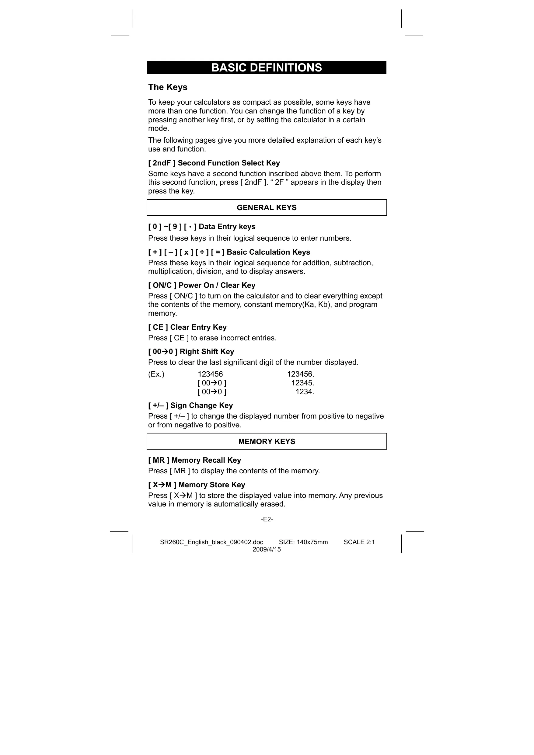 -E1SR260C_English_black_090402.doc SIZE: 140x75mm 2009/4/15 SCALE 2:1 BASIC DEFINITIONS The Keys To keep your calculators as compact as possible, some keys have more than one function. You can change the function of a key by pressing another key first, or by setting the calculator in a certain mode. The following pages give you more detailed explanation of each key’s use and function. [ 2ndF ] Second Function Select Key Some keys have a second function inscribed above them. To perform this second function, press [ 2ndF ]. “ 2F ” appears in the display then press the key. GENERAL KEYS [ 0 ] ~[ 9 ] [‧] Data Entry keys Press these keys in their logical sequence to enter numbers. [ + ] [ – ] [ x ] [ ÷ ] [ = ] Basic Calculation Keys Press these keys in their logical sequence for addition, subtraction, multiplication, division, and to display answers. [ ON/C ] Power On / Clear Key Press [ ON/C ] to turn on the calculator and to clear everything except the contents of the memory, constant memory(Ka, Kb), and program memory. [ CE ] Clear Entry Key Press [ CE ] to erase incorrect entries. [ 00Æ0 ] Right Shift Key Press to clear the last significant digit of the number displayed. (Ex.)