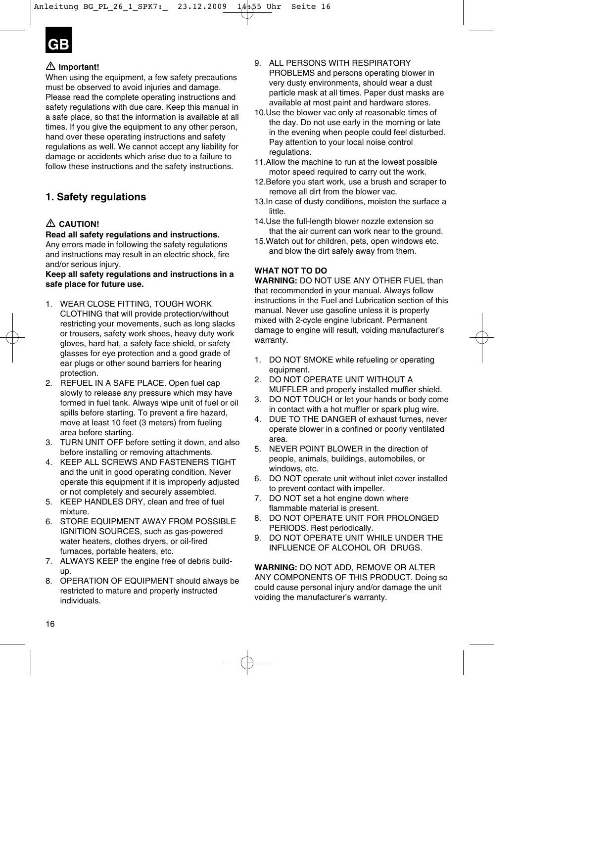 PROBLEMS and persons operating blower in very dusty environments, should wear a dust particle mask at all times. Paper dust masks are available at most paint and hardware stores. 10.Use the blower vac only at reasonable times of the day. Do not use early in the morning or late in the evening when people could feel disturbed. Pay attention to your local noise control regulations. 11.Allow the machine to run at the lowest possible motor speed required to carry out the work. 12.Before you start work, use a brush and scraper to remove all dirt from the blower vac. 13.In case of dusty conditions, moisten the surface a little. 14.Use the full-length blower nozzle extension so that the air current can work near to the ground. 15.Watch out for children, pets, open windows etc. and blow the dirt safely away from them.
