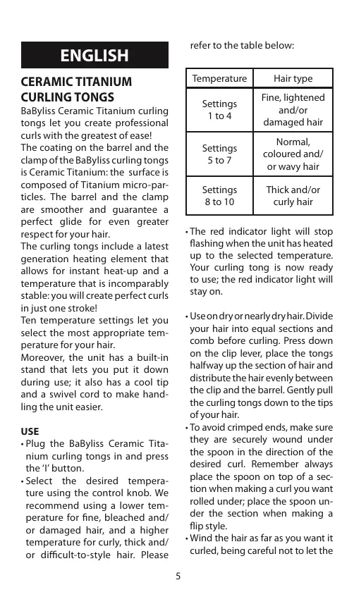 refer to the table below: BaByliss Ceramic Titanium curling tongs let you create professional curls with the greatest of ease! The coating on the barrel and the clamp of the BaByliss curling tongs is Ceramic Titanium: the surface is composed of Titanium micro-particles. The barrel and the clamp are smoother and guarantee a perfect glide for even greater respect for your hair. The curling tongs include a latest generation heating element that allows for instant heat-up and a temperature that is incomparably stable: you will create perfect curls in just one stroke! Ten temperature settings let you select the most appropriate temperature for your hair. Moreover, the unit has a built-in stand that lets you put it down during use; it also has a cool tip and a swivel cord to make handling the unit easier. Temperature Hair type Settings 1 to 4 Fine, lightened and/or damaged hair Settings 5 to 7 Normal, coloured and/ or wavy hair Settings 8 to 10 Thick and/or curly hair