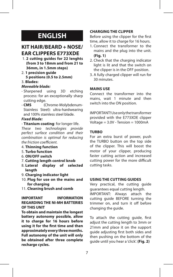 IMPORTANT! Use only the transformer provided with the E773XDE clipper Voltage = 3.0V - Tension = 1000mA TURBO For an extra burst of power, push the TURBO button on the top side of the clipper. This will boost the motor of your clipper, producing faster cutting action and increased cutting power for the more difficult cutting tasks. USING THE CUTTING GUIDES Very practical, the cutting guide guarantees equal cutting length. IMPORTANT: Always attach the cutting guide BEFORE turning the trimmer on, and turn it off before changing the guide.