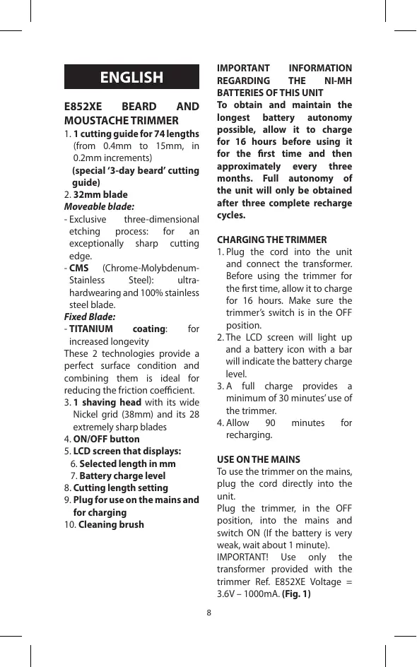 Pour atteindre et préserver la plus grande autonomie possible des batteries, effectuer une charge de 16 heures avant la première utilisation et tous les 3 mois environ. La pleine autonomie du produit ne sera atteinte qu’après 3 cycles de charge complets. CHARGER LA TONDEUSE 1. E nficher la fiche dans l’appareil et brancher le transfo. Avant d’utiliser la tondeuse pour la première fois, la charger pendant 16 heures. S’assurer que l’interrupteur de la tondeuse est en position OFF. 2. L ’écran LCD s’illumine et une batterie indique l’état de charge de l’appareil grâce à une barre de défilement. 3. U ne charge complète permet d’utiliser la tondeuse pendant un minimum de 30 minutes. 4. L a durée des charges suivantes est de 90 minutes. UTILISATION SUR SECTEUR Pour utiliser la tondeuse sur secteur, enficher la fiche directement dans l’appareil. Brancher la tondeuse éteinte sur le secteur et mettre en position ON (Si la batterie est très faible, attendre environ 1 minute). IMPORTANT ! Utiliser exclusivement le transfo fourni avec la tondeuse Réf. E852XE Voltage = 3,6V – 1000mA. (Fig. 1)