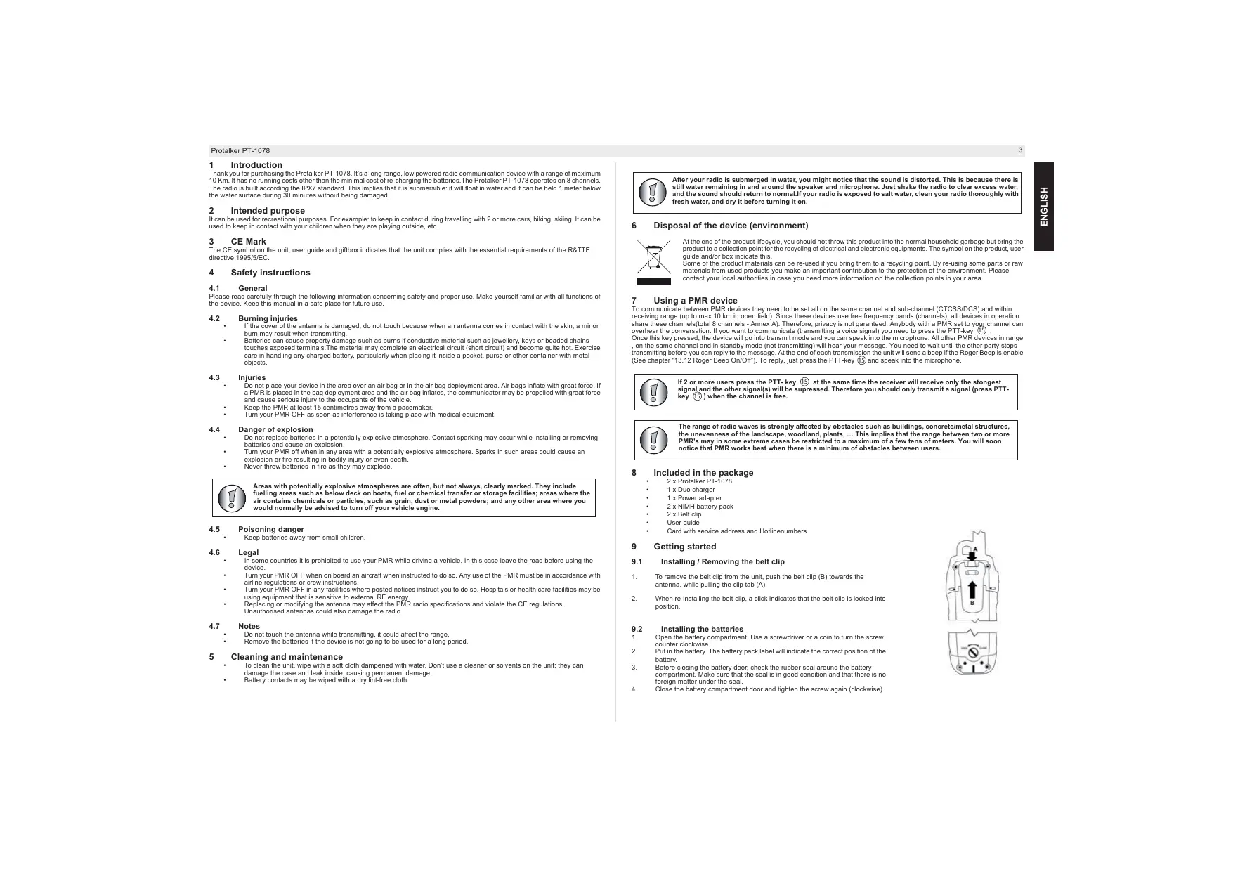 Thank you for purchasing the Protalker PT-1078. It's a long range, low powered radio communication device with a range of maximum 10 Km. It has no running costs other than the minimal cost of re-charging the batteries. The Protalker PT-1078 operates on 8 channels. The radio is built according the IPX7 standard. This implies that it is submersible: it will float in water and it can be held 1 meter below the water surface during 30 minutes without being damaged.