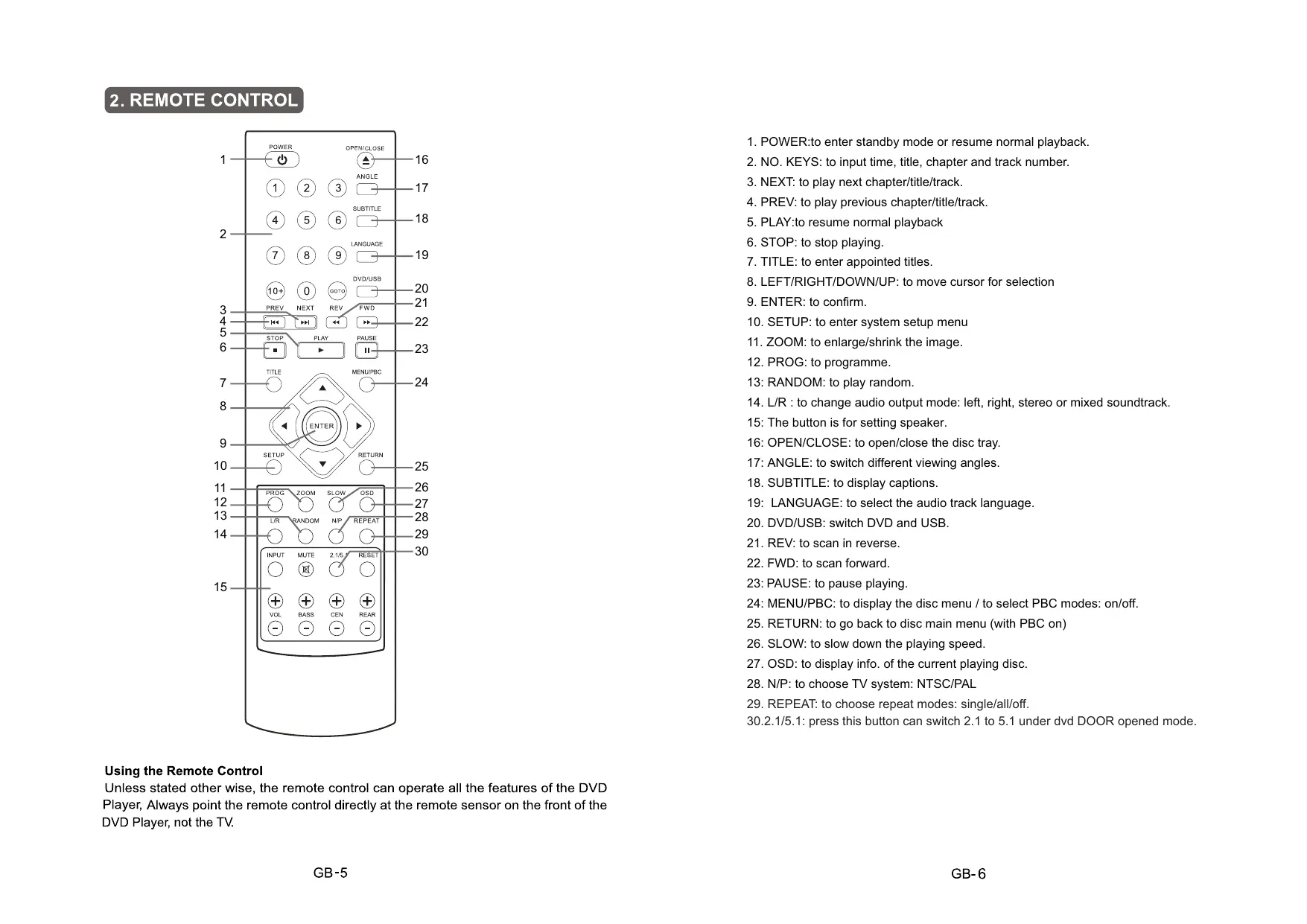24: MENU/PBC: to display the disc menu / to select PBC modes: on/off. 25. RETURN: to go back to disc main menu (with PBC on) 26. SLOW: to slow down the playing speed. 27. OSD: to display info. of the current playing disc. 28. N/P: to choose TV system: NTSC/PAL 29. REPEAT: to choose repeat modes: single/all/off. 30.2.1/5.1: press this button can switch 2.1 to 5.1 under dvd DOOR opened mode.