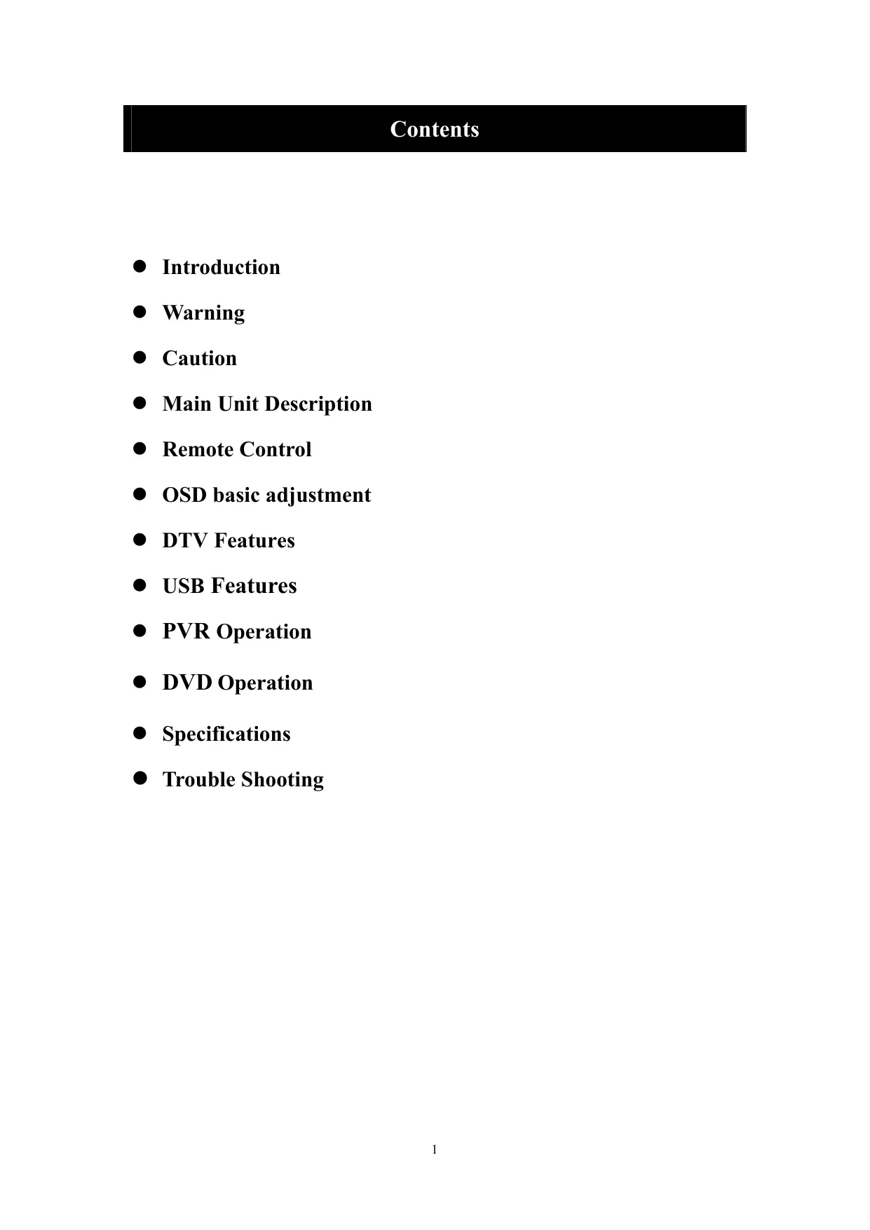 z Introduction z Warning z Caution z Main Unit Description z Remote Control z OSD basic adjustment z DTV Features z USB Features z PVR Operation z DVD Operation z Specifications
