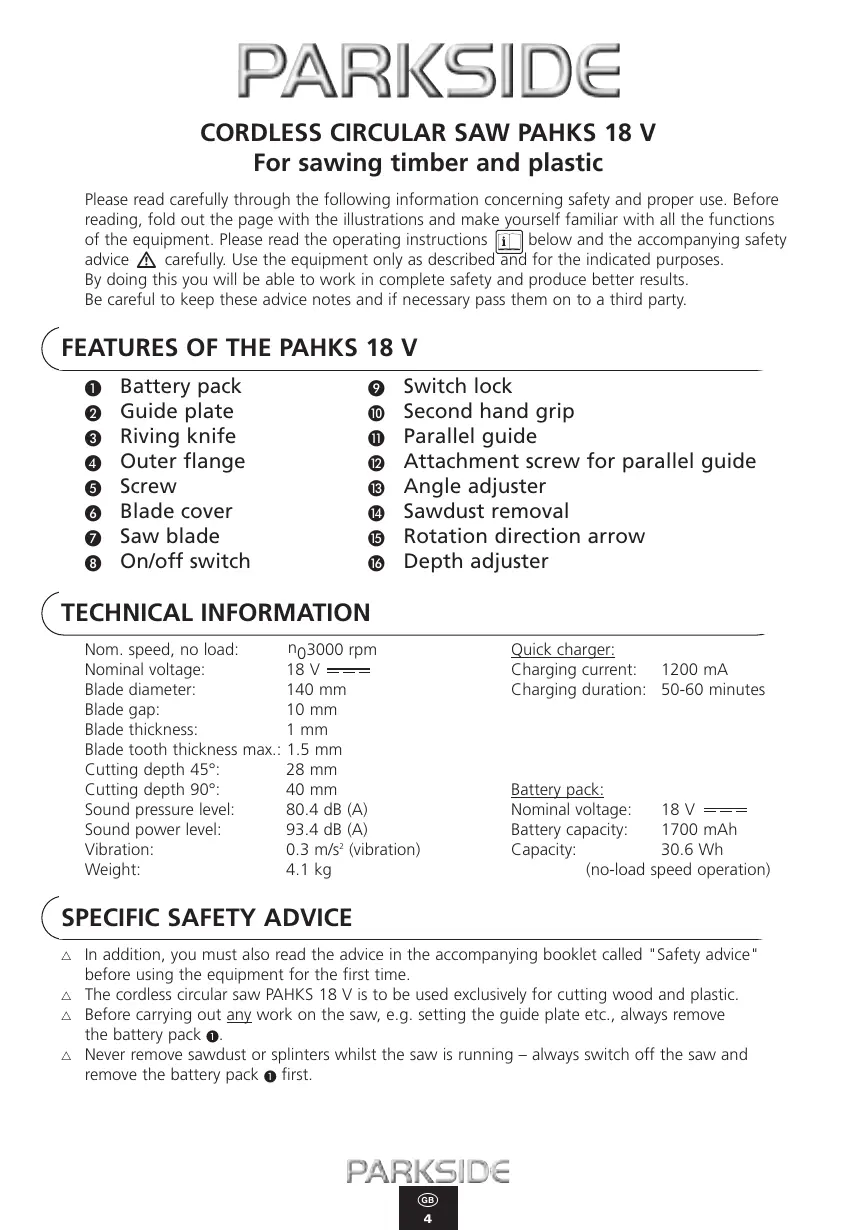 In addition, you must also read the advice in the accompanying booklet called “Safety advice" before using the equipment for the first time The cordless circular saw PAHKS 18 V is to be used exclusively for cutting wood and plastic. Before carrying out any work on the saw, e.g. setting the guide plate etc., ahways remove the battery pack @. Never remove sawdust or splinters whilst the saw is running — always switch off the saw and remove the battery pack @ first.