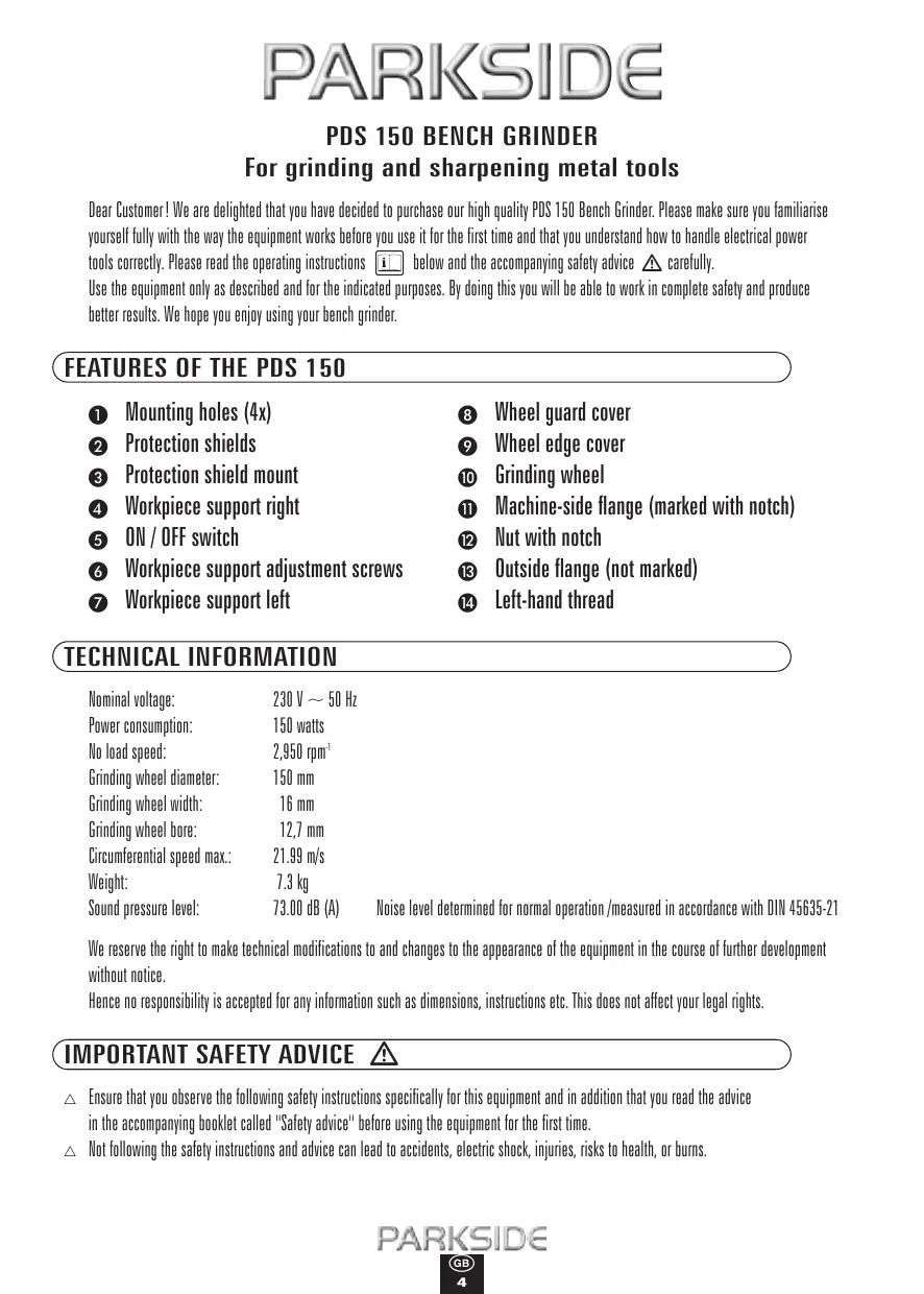 ominal voltage: OV — 80 He Power consumption: 150 watts Ilo load speed: 2,950 rpm Grinding wheel diameter: 160 mm Grinding wheel width: 16 mm Grinding wheel bore: 127 mm Circumferential speed max.: 21.38 ms Weight: T3kg Sound pressure level: 73.00 dB (A) Hoise level determined for normal operation /measured in accordance with DIN 45635-21 le reserve the right to make technical modifications to and changes to the appearance of the equipment in the course of further development without notice. Hence no responsibility is accepted for any information such as dimensions, instructions etc. This does not affect your legal rights. GIMPORTANT SAFETY ADVICE À ) A Ensure that you observe the following saety instructions specifically for this equipment and in addition that you read the advice in the accompanying booklet called "Safety advice" before using the equipment for the rt time. A Hottollowing the safety instructions and advice can lead to accidents, electre shock, injuries, rsks to health, or bus. PARKSIDE