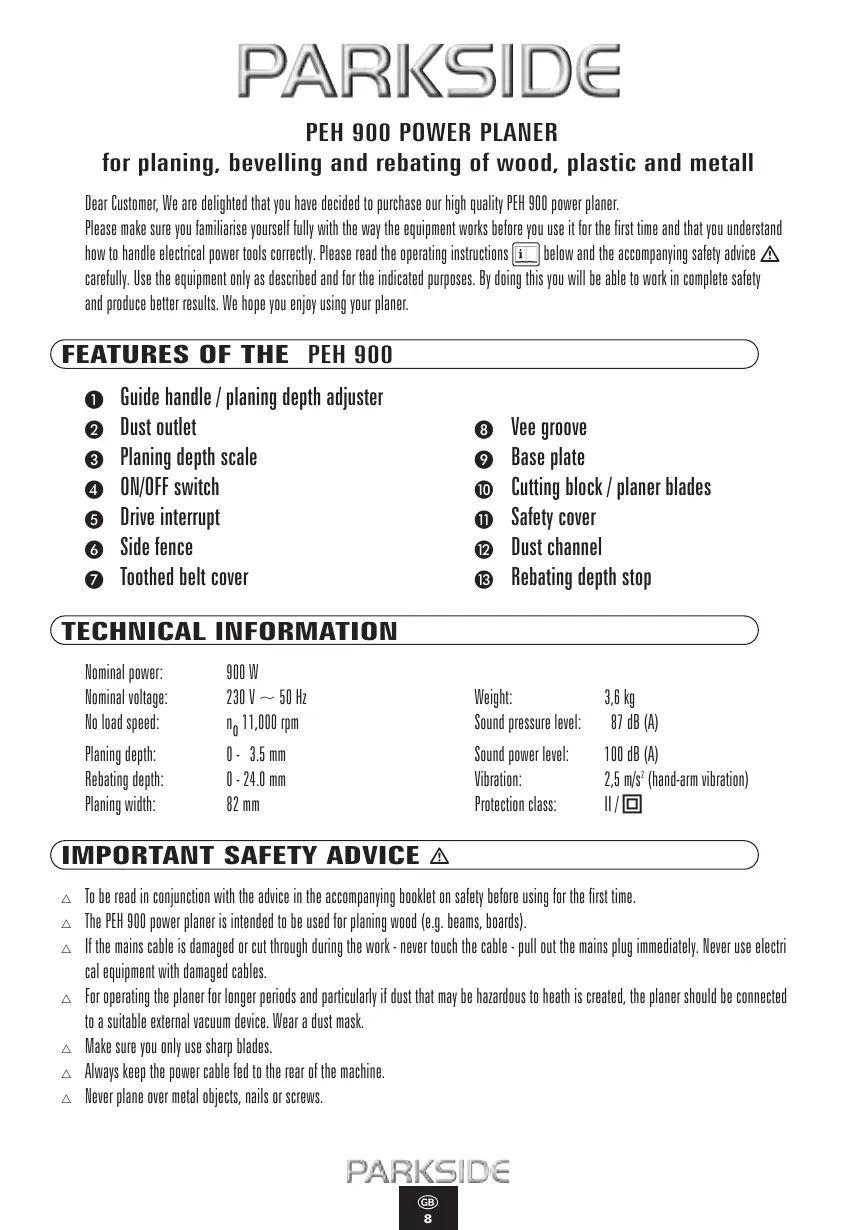 for planing, bevelling and rebating of wood, plastic and metall Dear Customer, We are delighted that you have decided to purchase our high quality PEH 900 power planer. Please make sure you familiarise yourself fully with the way the equipment works before you use it for the first time and that you understand how to handle electrical power tools correctly. Please read the operating instructions below and the accompanying safety advice carefully. Use the equipment only as described and for the indicated purposes. By doing this you will be able to work in complete safety and produce better results. We hope you enjoy using your planer.