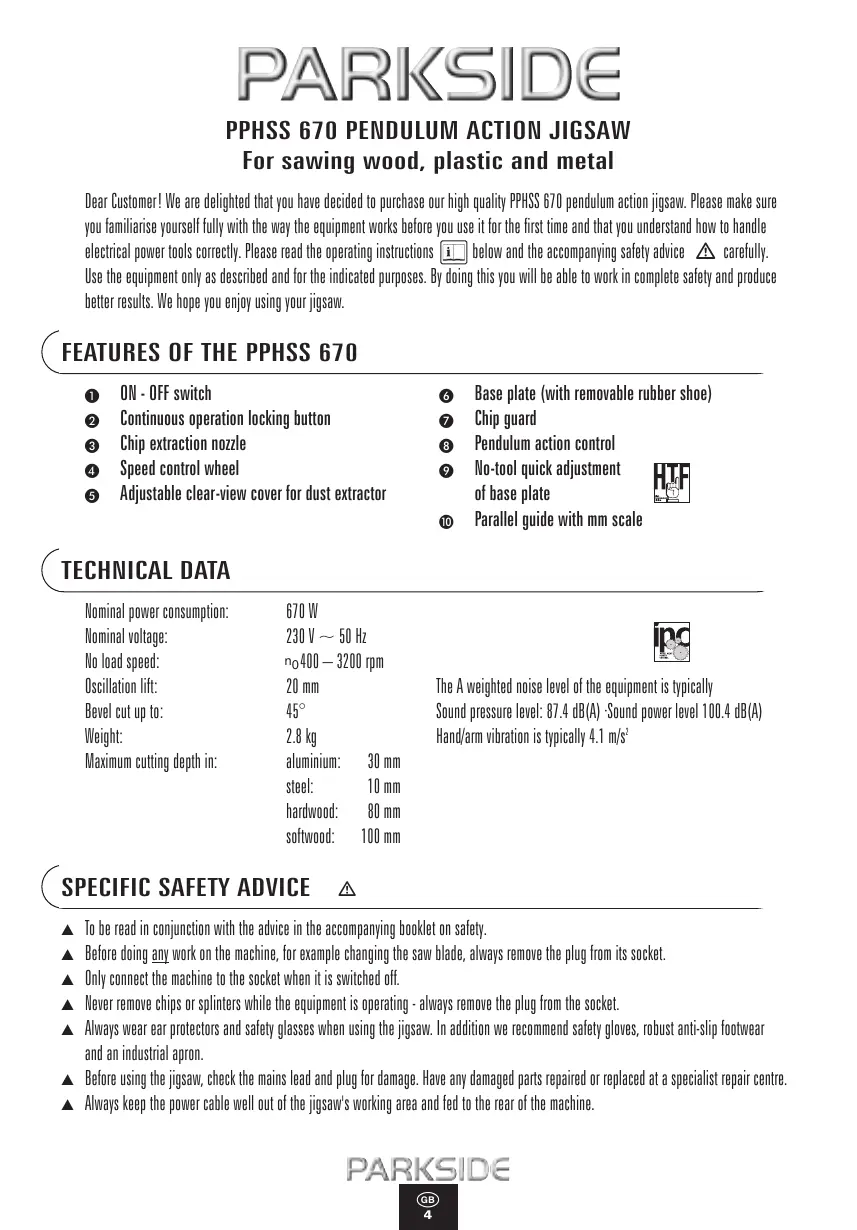 For sawing wood, plastic and metal Dear Customer! We are delighted that you have decided to purchase our high quality PPHSS 670 pendulum action jigsaw. Please make sure you familiarise yourself fully with the way the equipment works before you use it for the first time and that you understand how to handle electrical pourer tools correctl. Please read the operating instructions (on) below and the accompanying safety advice ZX carefull. Use the equipment only as described and for the indicated purposes. By doing this you will be able to work in complete safety and produce better results. We hope you enjoy using your jigsau.