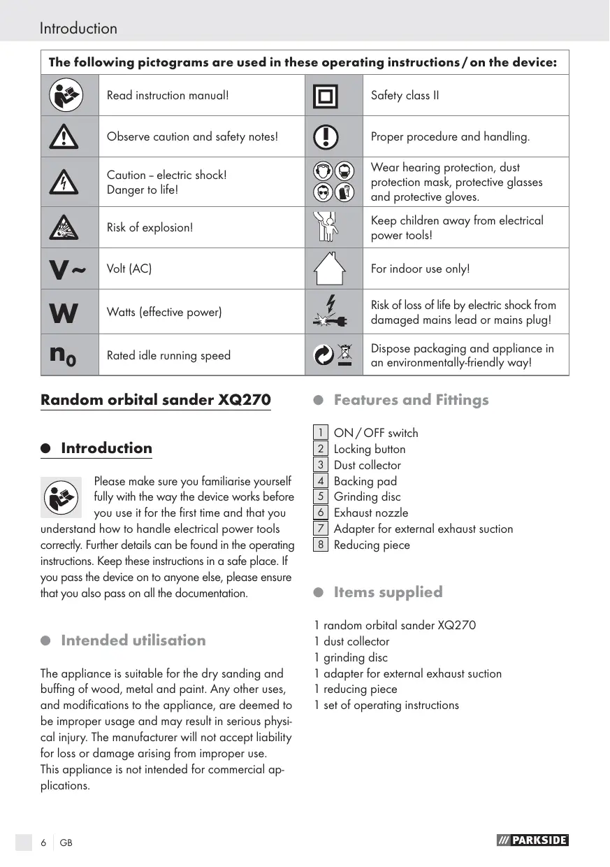 The appliance is suitable for the dry sanding and buffing of wood, metal and paint. Any other uses, and modifications to the appliance, are deemed to be improper usage and may result in serious physi- cal injury. The manufacturer will not accept liability for loss or damage arising from improper use.
