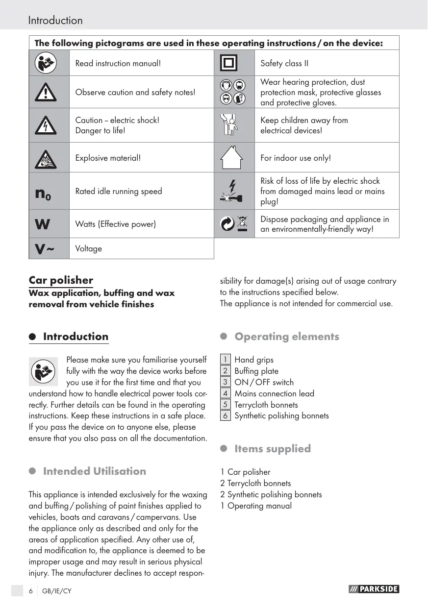 This appliance is intended exclusively for the waxing and buffing / polishing of paint finishes applied to vehicles, boats and caravans / campervans. Use he appliance only as described and only for the areas of application specified. Any ofher use of, and modification to, the appliance is deemed to be improper usage and may result in serious physical injury. The manufacturer declines to accept respon-