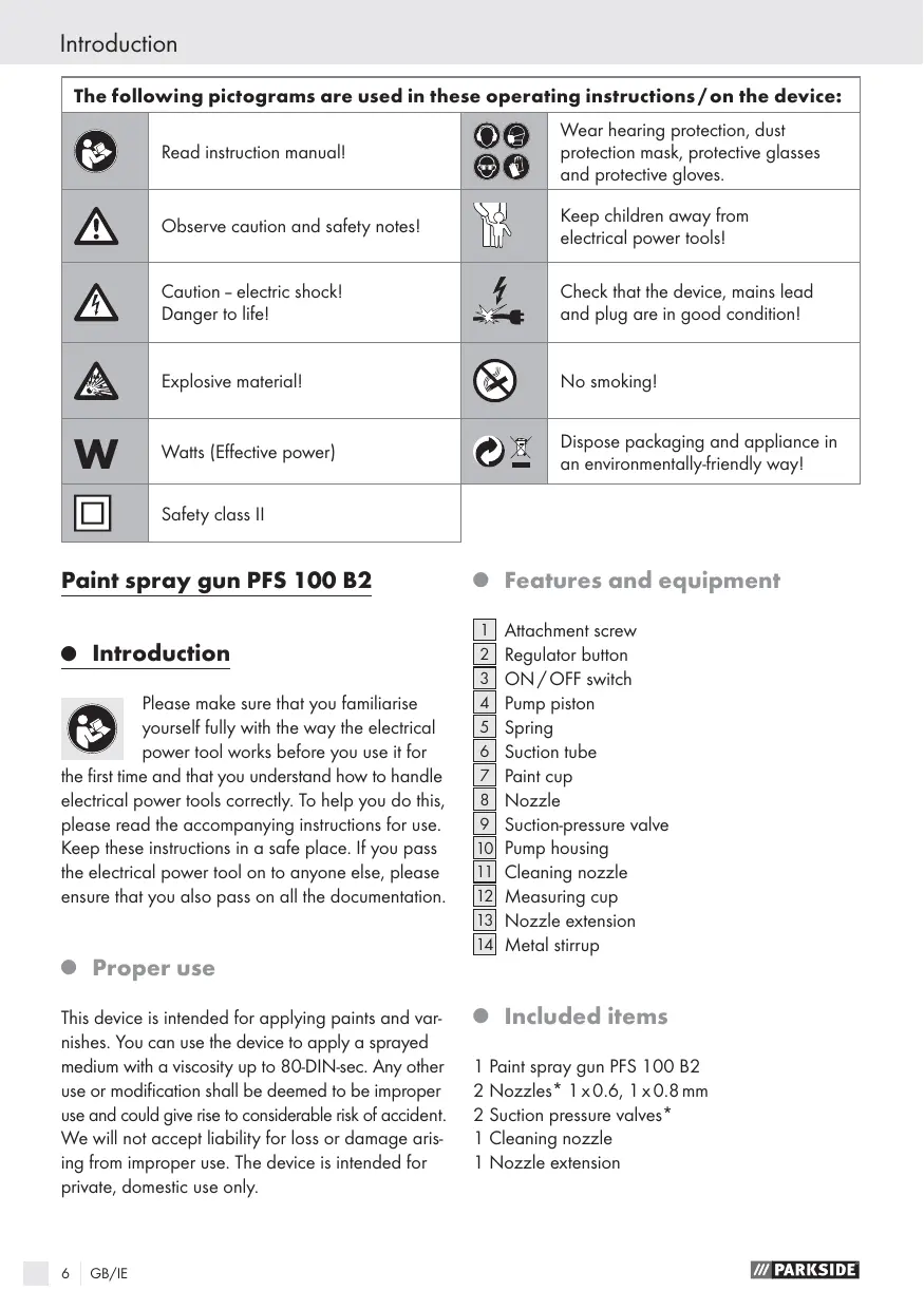 Introduction Proper use. Page 6 Features and equipment Page 6 Included items …….. Page 6 TChRICAI data OGC 7 General safety advice for electrical power tools 1. Workplace safety . Page 7 2. Electrical safety . Page 7 3. Personal safety... Page 8 À. Careful handling and use of elecirical power tool . Page 8 AGifiOnal sQfEHy Advice For Paint SPFAY QU mn. PO Ÿ Advice on use DINsec / Viscosity… Page 9 Preparing the sprayed medium … Page 9 Preparing the surface to be sprayed .Page 10 Bringing into use Selecting the nozzle Page 10 Switching ON /OFF. Page 10 Spraying process .… Page 10 Maintenance and cleaning. Poce |] Service centre OC |] M arranty Page 11 Disposal Poe 12 Declaration of Conformity /Manufacturer... .Page 13