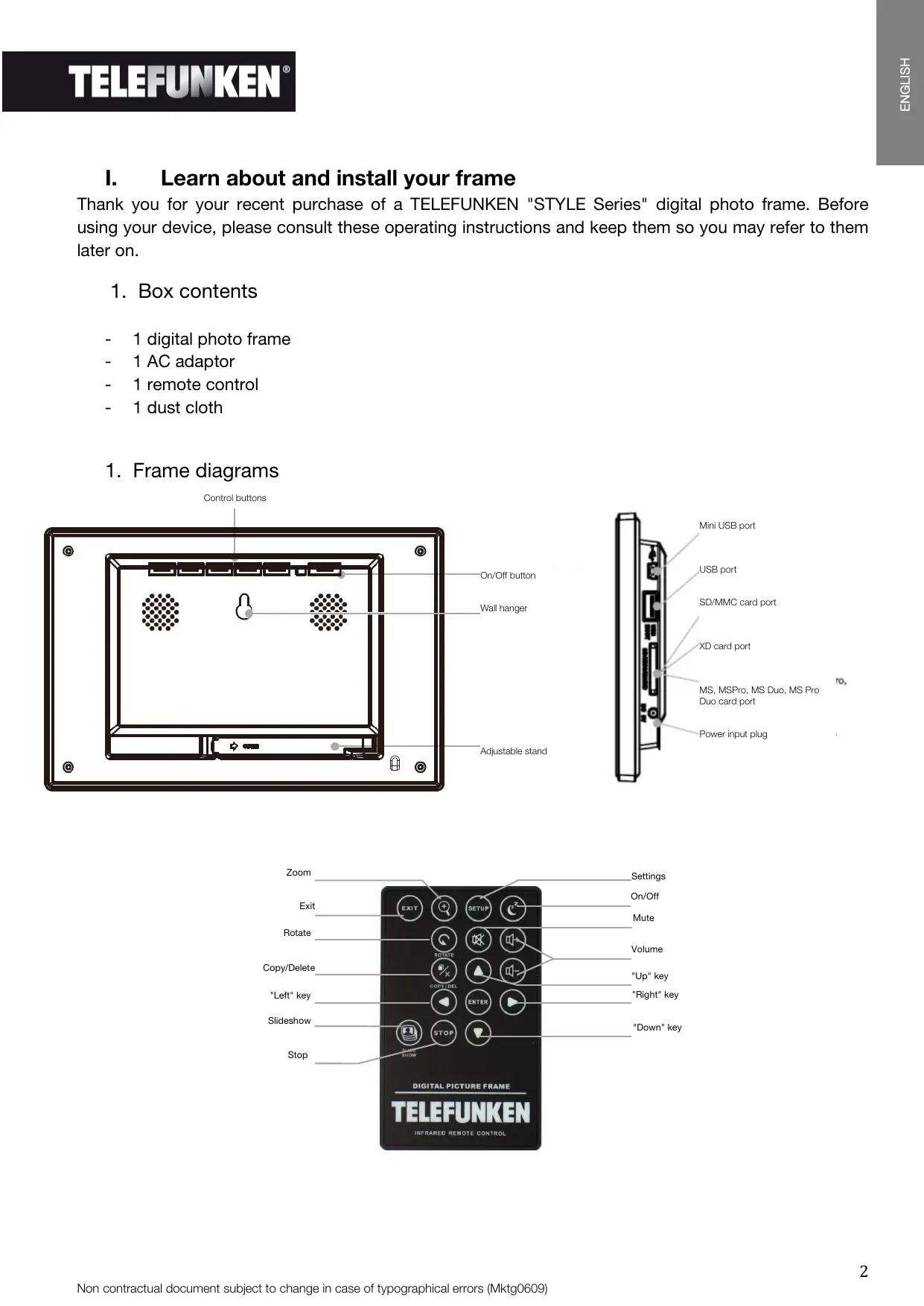 Thank you for your recent purchase of a TELEFUNKEN "STYLE Series" digital photo frame. Before using your device, please consult these operating instructions and keep them so you may refer to them later on.