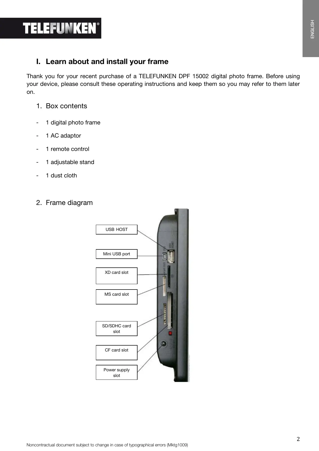 Thank you for your recent purchase of a TELEFUNKEN DPF 15002 digital photo frame. Before using your device, please consult these operating instructions and keep them so you may refer to them later on.