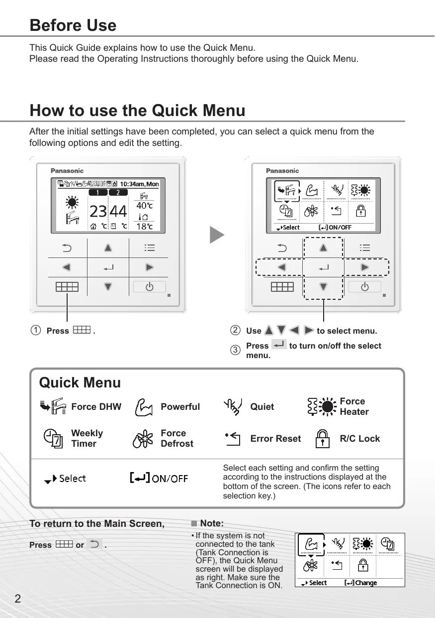 - If the system is not connected to the tank (Tank Connection is OFF), the Quick Menu screen will be displayed as right. Make sure the Tank Connection is ON.