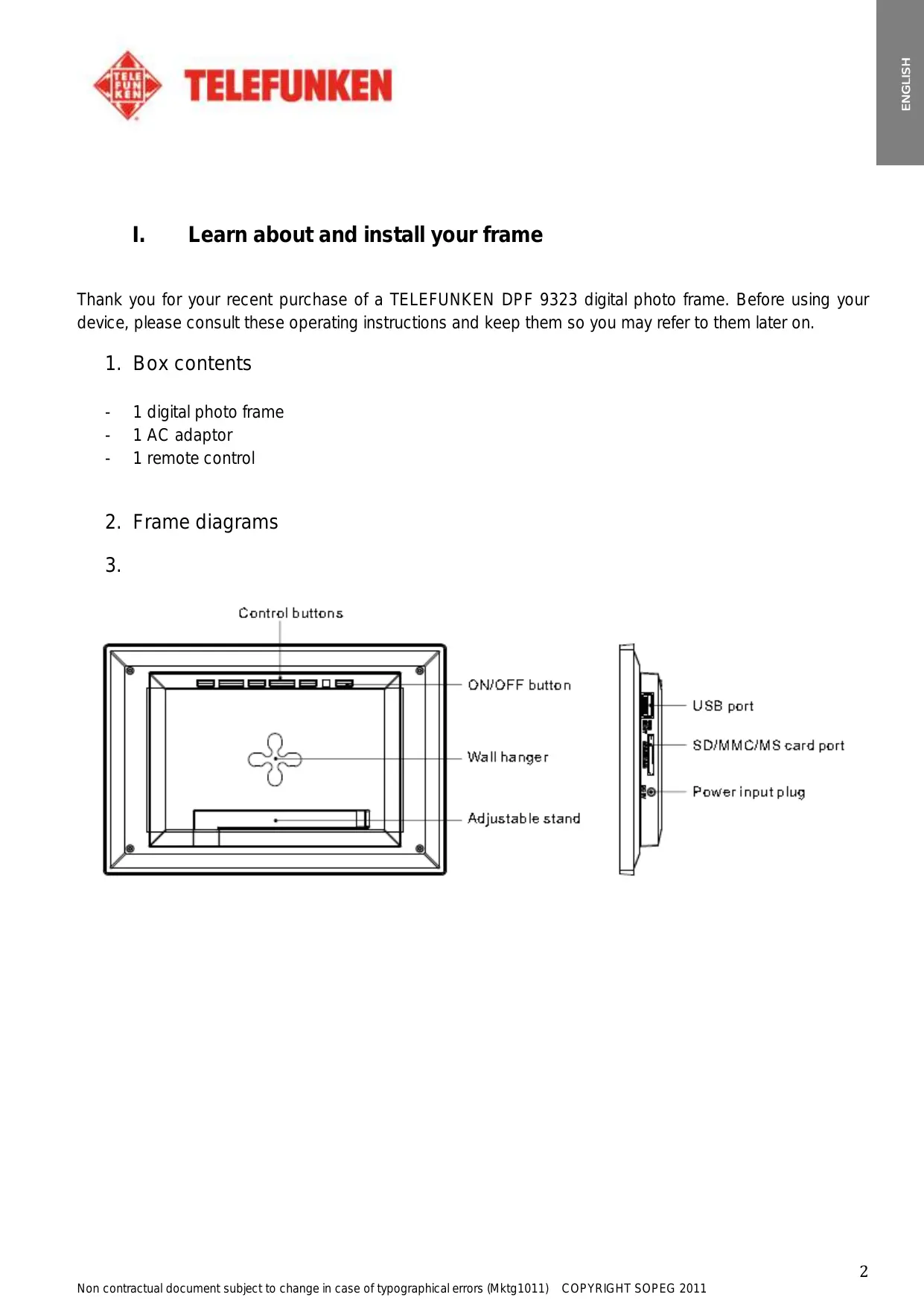 Learn about and install your frame Thank you for your recent purchase of a TELEFUNKEN DPF 9323 digital photo frame. Before using your device, please consult these operating instructions and keep them so you may refer to them later on.