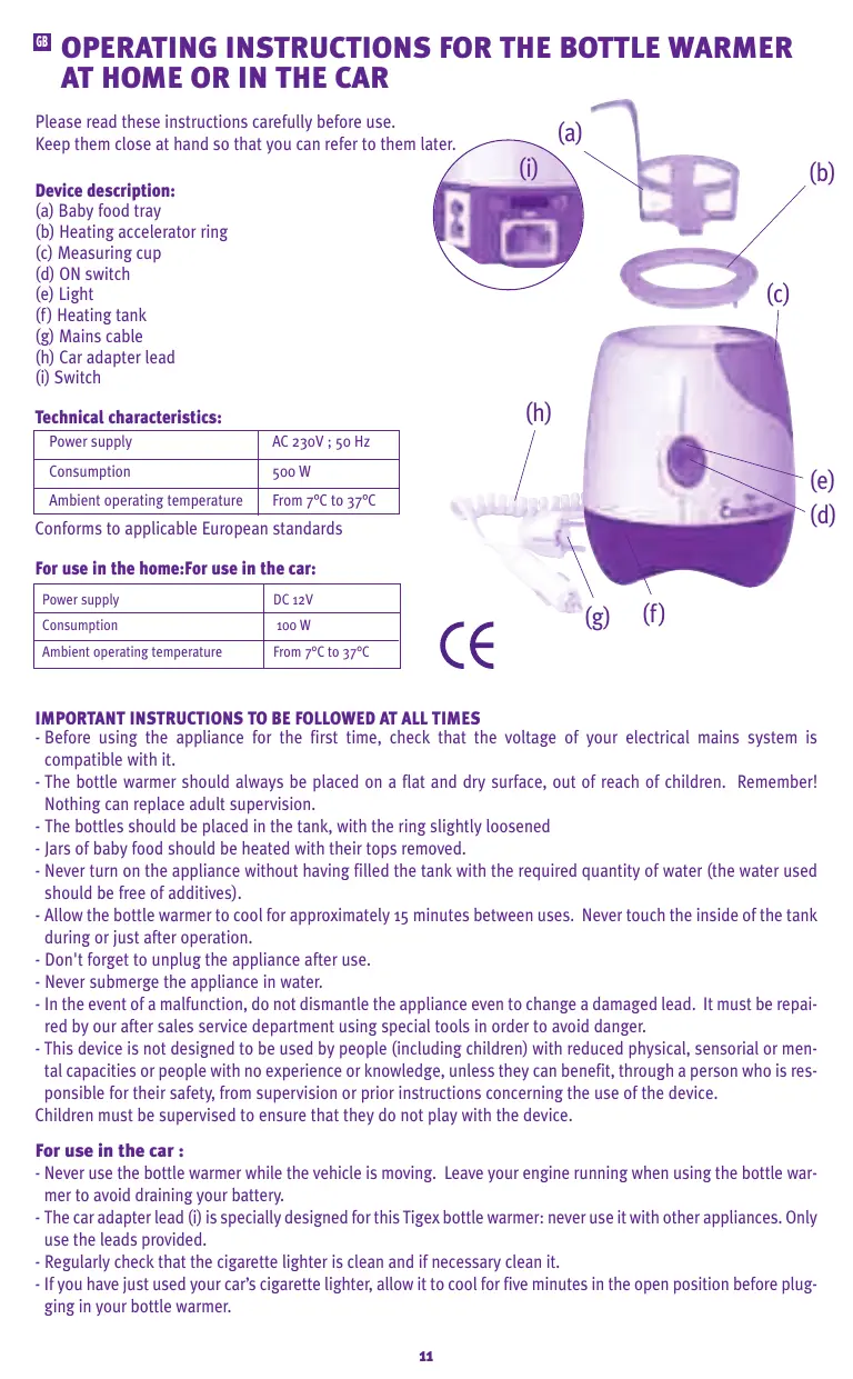 Please read these instructions carefully before use. Keep them close at hand so that you can refer to them later. (a) (i) (b) Device description: (a) Baby food tray (b) Heating accelerator ring (c) Measuring cup (d) ON switch (e) Light (f) Heating tank (g) Mains cable (h) Car adapter lead (i) Switch (c) (h) Technical characteristics: Power supply AC 230V ; 50 Hz Consumption 500 W Ambient operating temperature From 7°C to 37°C (e) (d) Conforms to applicable European standards For use in the home:For use in the car: Power supply DC 12V Consumption 100 W Ambient operating temperature From 7°C to 37°C (g) (f) IMPORTANT INSTRUCTIONS TO BE FOLLOWED AT ALL TIMES - Before using the appliance for the first time, check that the voltage of your electrical mains system is compatible with it. - The bottle warmer should always be placed on a flat and dry surface, out of reach of children. Remember! Nothing can replace adult supervision. - The bottles should be placed in the tank, with the ring slightly loosened - Jars of baby food should be heated with their tops removed. - Never turn on the appliance without having filled the tank with the required quantity of water (the water used should be free of additives). - Allow the bottle warmer to cool for approximately 15 minutes between uses. Never touch the inside of the tank during or just after operation. - Don't forget to unplug the appliance after use. - Never submerge the appliance in water. - In the event of a malfunction, do not dismantle the appliance even to change a damaged lead. It must be repaired by our after sales service department using special tools in order to avoid danger. - This device is not designed to be used by people (including children) with reduced physical, sensorial or mental capacities or people with no experience or knowledge, unless they can benefit, through a person who is responsible for their safety, from supervision or prior instructions concerning the use of the device. Children must be supervised to ensure that they do not play with the device. For use in the car : - Never use the bottle warmer while the vehicle is moving. Leave your engine running when using the bottle warmer to avoid draining your battery. - The car adapter lead (i) is specially designed for this Tigex bottle warmer: never use it with other appliances. Only use the leads provided. - Regularly check that the cigarette lighter is clean and if necessary clean it. - If you have just used your car’s cigarette lighter, allow it to cool for five minutes in the open position before plugging in your bottle warmer.