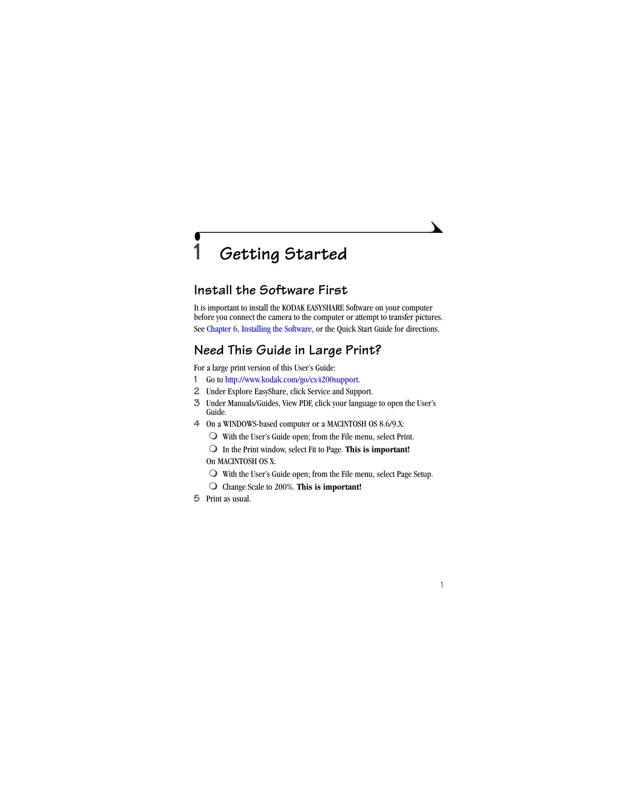 Getting Started Install the Software First Itis important to install the KODAK EASYSHARE Software on your computer before you connect the camera to the computer or attempt to transfer pictures. See Chapter 6, Installing the Software, or the Quick Start Guide for directions. Need This Guide in Large Print? For a large print version of this User's Guide: