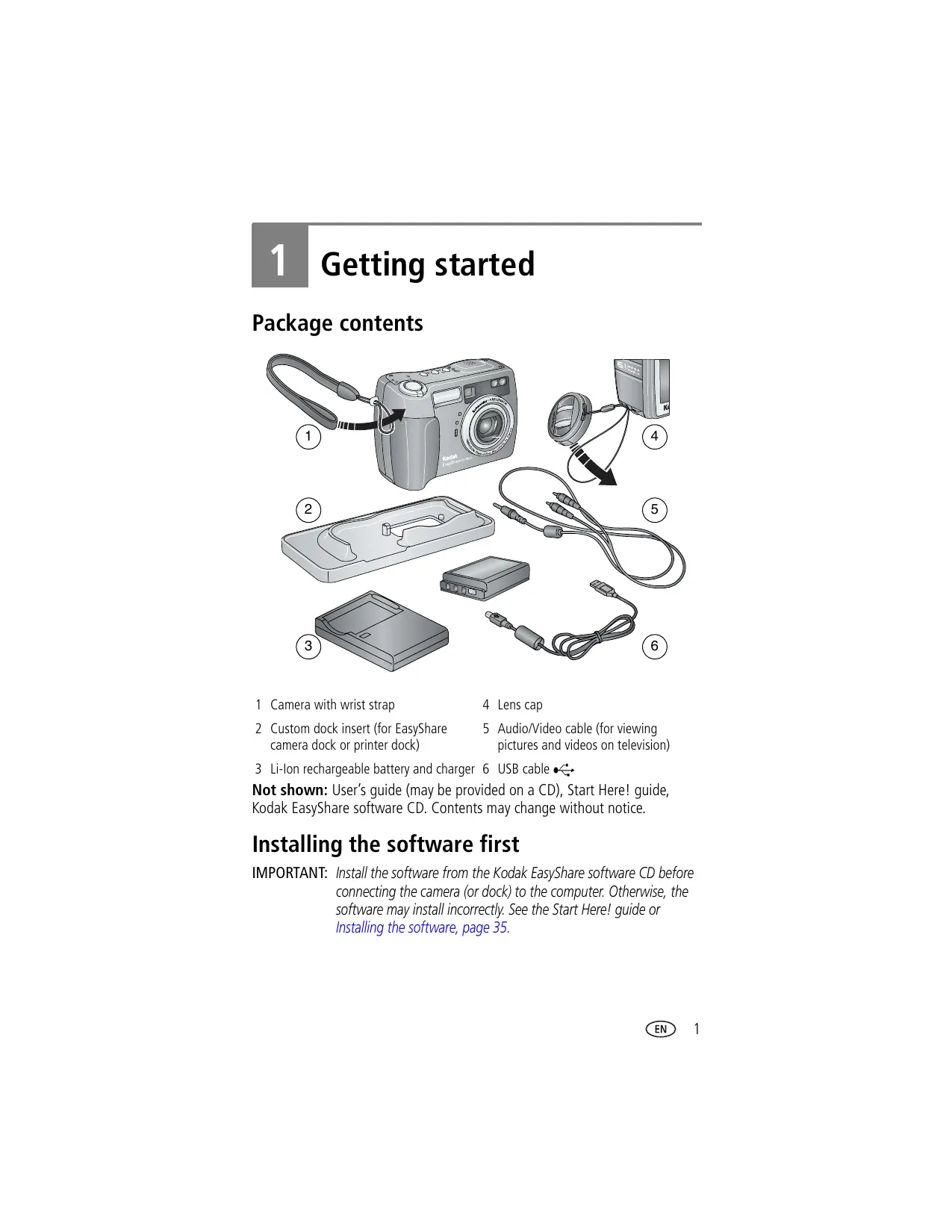 FE Getting started Package contents 1 Camera with wrist strap 4 Lens cap 2 Custom dock insert (for EasyShare 5 Audio/Video cable (for viewing camera dock or printer dock) pictures and videos on television) 3 Li-lon rechargeable battery and charger 6 USB cable <+ Not shown: User's guide (may be provided on a CD), Start Here! guide, Kodak EasyShare software CD. Contents may change without notice. Installing the software first IMPORTANT: install the software from the Kodak EasyShare software CD before connecting the camera (or dock) to the computer. Otherwise, the software may install incorrectly. See the Start Here! guide or Installing the software, page 35.