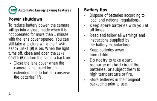 Power shutdown To reduce battery power, the camera will go into a sleep mode when it is not operated for more than 1 minute with the lens cover opened. You can still take a picture while the FLASHREADY LIGHT (9) is on. When the light turns off, close and open the LENS COVER (6) to turn the camera back on. • Close the lens cover when the camera is not used for an extended time to further conserve the batteries’ life.