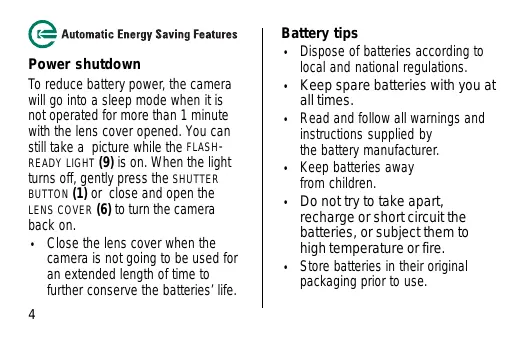 Power shutdown To reduce battery power, the camera will go into a sleep mode when it is not operated for more than 1 minute with the lens cover opened. You can still take a picture while the FLASHREADY LIGHT (9) is on. When the light turns off, gently press the SHUTTER BUTTON (1) or close and open the LENS COVER (6) to turn the camera back on. • Close the lens cover when the camera is not going to be used for an extended length of time to further conserve the batteries’ life. 4