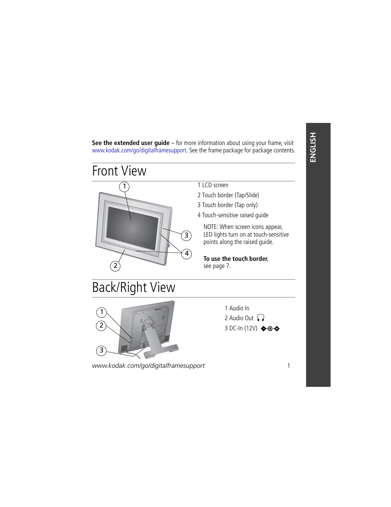 See the extended user guide — for more information about using your frame, visit www.kodak.com/go/digitalframesupport. See the frame package for package contents. Front View 1 LCD screen 2 Touch border (Tap/Slide) 3 Touch border (Tap only) 4 Touch-sensitive raised guide NOTE: When screen icons appear, LED lights turn on at touch-sensitive points along the raised guide. To use the touch border, see page 7. 1 Audio In 2 Audio Out () 3 DC-In (12V) 66 www.kodak.com/go/digitalframesupport 1 ENGLISH