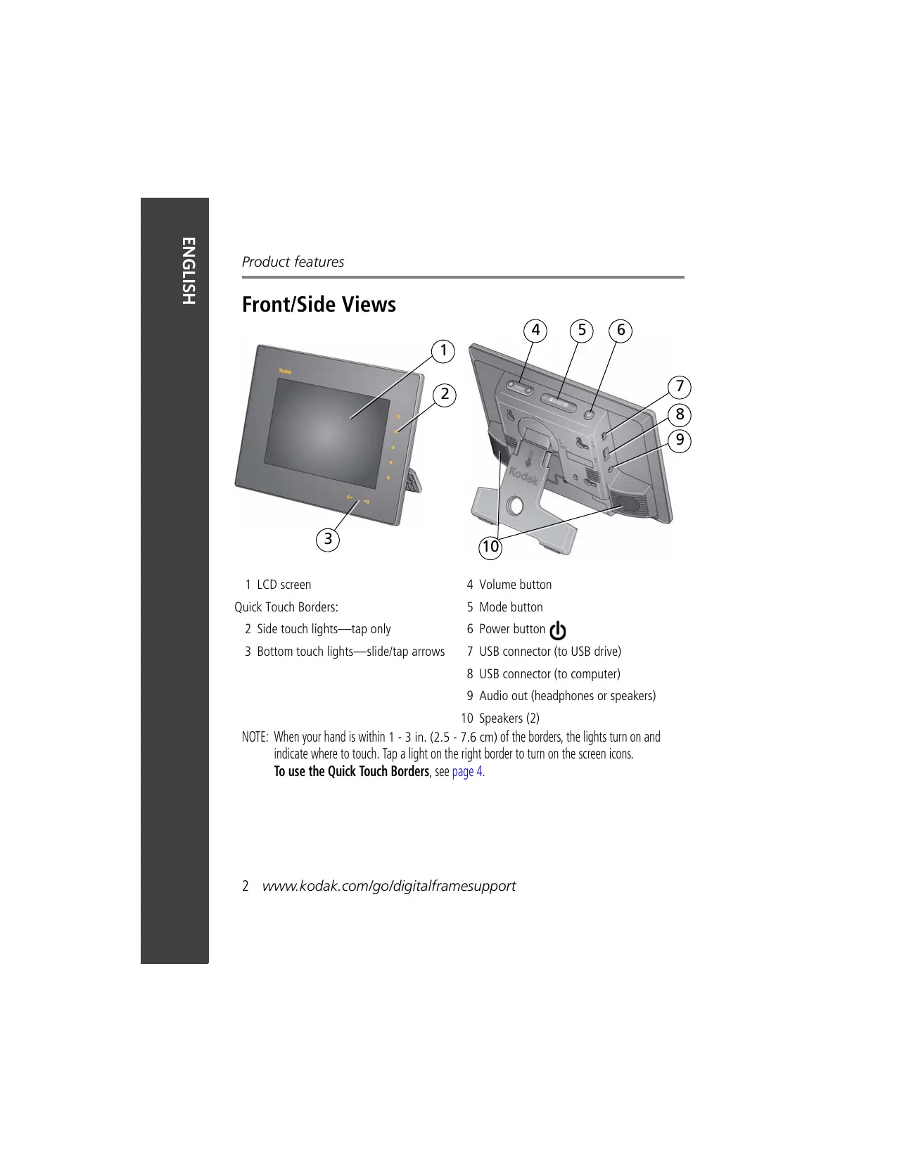 Product features Front/Side Views 1 LCD screen 4 Volume button Quick Touch Borders: 5 Mode button 2 Side touch lights—tap only 6 Power button [0] 3 Bottom touch lights—slide/tap arrows 7 USB connector (to USB drive) 8 USB connector (to computer) 9 Audio out (headphones or speakers) 10 Speakers (2) NOTE: When your hand is within 1 - 3 in. (2.5 - 7.6 cm) of the borders, the lights turn on and indicate where to touch. Tap a light on the right border to turn on the screen icons. To use the Quick Touch Borders, see page 4. 2 www.kodak.com/go/digitalframesupport