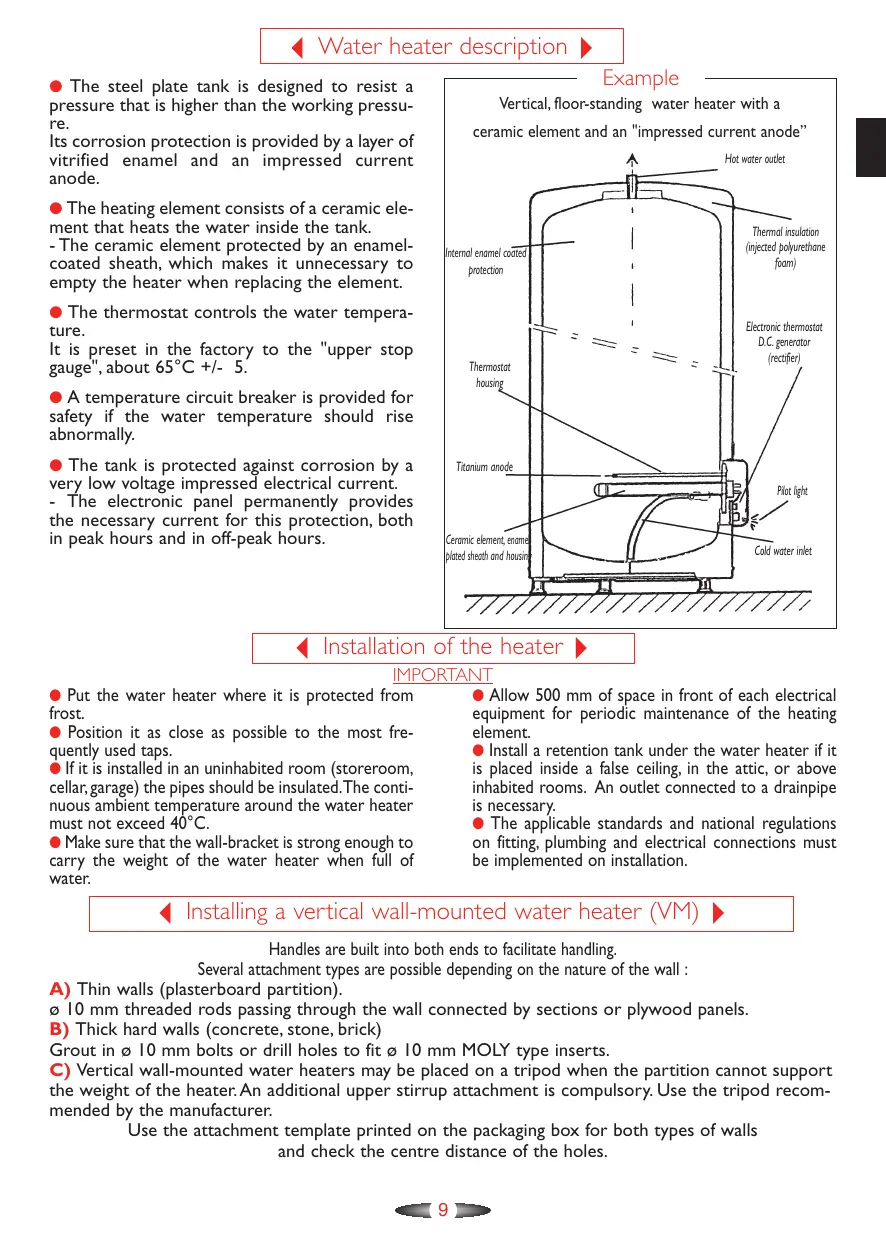 3Water heater description4 Example ● The steel plate tank is designed to resist a pressure that is higher than the working pressure. Its corrosion protection is provided by a layer of vitrified enamel and an impressed current anode. Vertical, floor-standing water heater with a ceramic element and an "impressed current anode” Hot water outlet ● The heating element consists of a ceramic ele- ment that heats the water inside the tank. - The ceramic element protected by an enamelcoated sheath, which makes it unnecessary to empty the heater when replacing the element. Internal enamel coated protection ● The thermostat controls the water tempera- ture. It is preset in the factory to the "upper stop gauge", about 65°C +/- 5. Thermostat housing ● A temperature circuit breaker is provided for safety if the water temperature should rise abnormally. ● The tank is protected against corrosion by a very low voltage impressed electrical current. - The electronic panel permanently provides the necessary current for this protection, both in peak hours and in off-peak hours. Thermal insulation (injected polyurethane foam) Electronic thermostat D.C. generator (rectifier) Titanium anode Pilot light Ceramic element, enamel plated sheath and housing Cold water inlet 3Installation of the heater4 IMPORTANT ● Allow 500 mm of space in front of each electrical frost. equipment for periodic maintenance of the heating ● Position it as close as possible to the most freelement. ● Install a retention tank under the water heater if it quently used taps. ● If it is installed in an uninhabited room (storeroom, is placed inside a false ceiling, in the attic, or above cellar, garage) the pipes should be insulated.The contiinhabited rooms. An outlet connected to a drainpipe nuous ambient temperature around the water heater is necessary. ● The applicable standards and national regulations must not exceed 40°C. ● Make sure that the wall-bracket is strong enough to on fitting, plumbing and electrical connections must be implemented on installation. carry the weight of the water heater when full of water. ● Put the water heater where it is protected from 3Installing a vertical wall-mounted water heater (VM)4 Handles are built into both ends to facilitate handling. Several attachment types are possible depending on the nature of the wall : A) Thin walls (plasterboard partition). ø 10 mm threaded rods passing through the wall connected by sections or plywood panels. B) Thick hard walls (concrete, stone, brick) Grout in ø 10 mm bolts or drill holes to fit ø 10 mm MOLY type inserts. C) Vertical wall-mounted water heaters may be placed on a tripod when the partition cannot support the weight of the heater. An additional upper stirrup attachment is compulsory. Use the tripod recommended by the manufacturer. Use the attachment template printed on the packaging box for both types of walls and check the centre distance of the holes.
