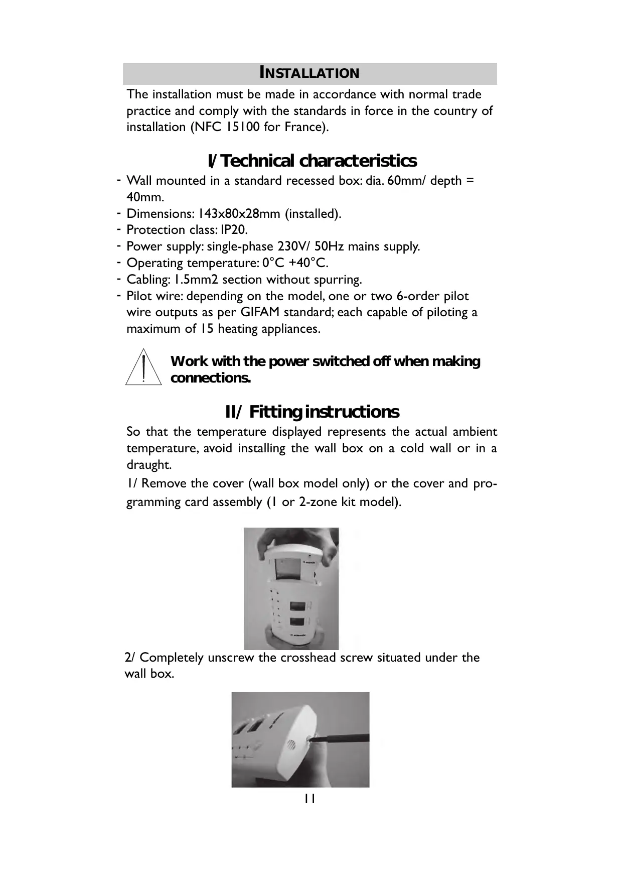 So that the temperature displayed represents the actual ambient temperature, avoid installing the wall box on a cold wall or in a draught. 1/ Remove the cover (wall box model only) or the cover and programming card assembly (1 or 2-zone kit model).